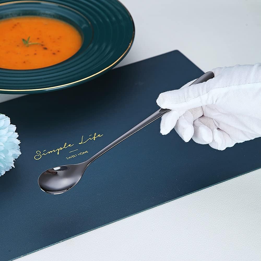 - 【Luxury and High Quality Finish】: These black Long Handle Spoon are polish with mirror finish and plating with titanium black. Looks luxury and beautiful. The black titanium plating would protect the surface of silverware from scrath. Food grade material healthy for daily use.