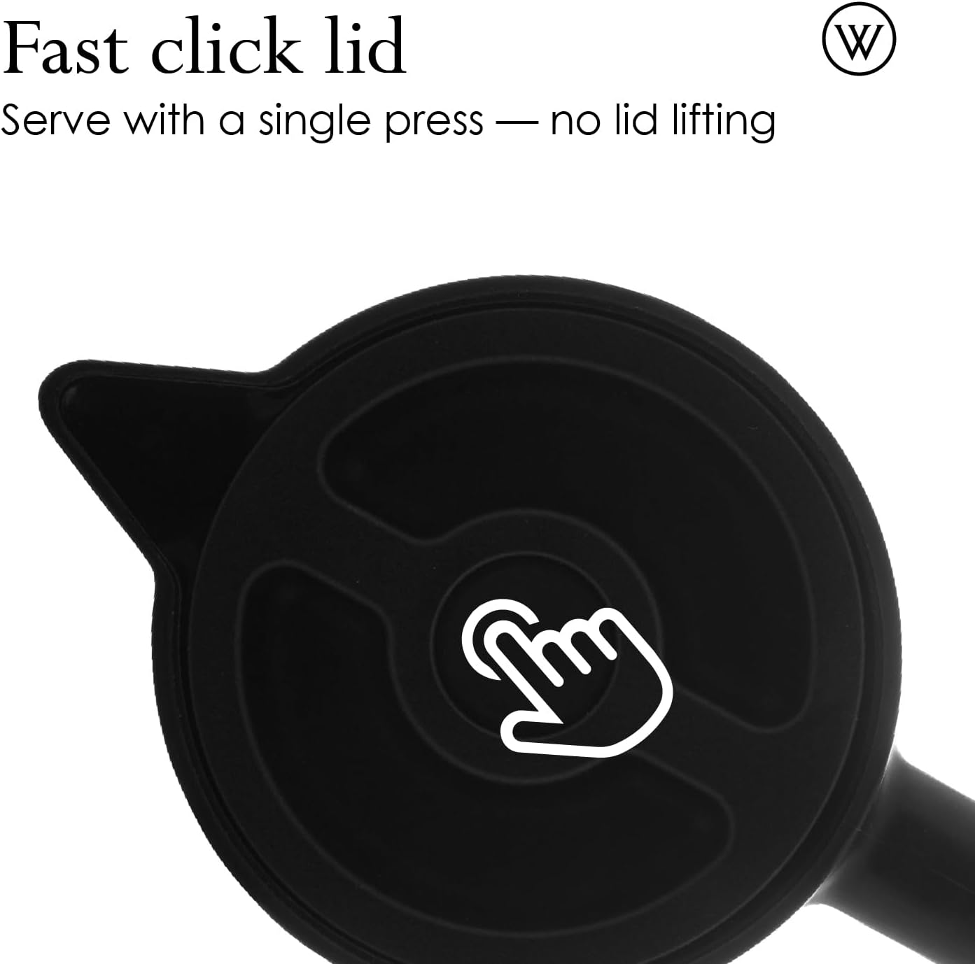 - 【ONE TOUCH POURING - NO NEED TO OPEN THE LID】Simply press the button on top to serve your drink effortlessly. The spout opens automatically, allowing for smooth, controlled pouring without removing the lid—helping maintain temperature and prevent heat or cold loss. No unscrewing needed!