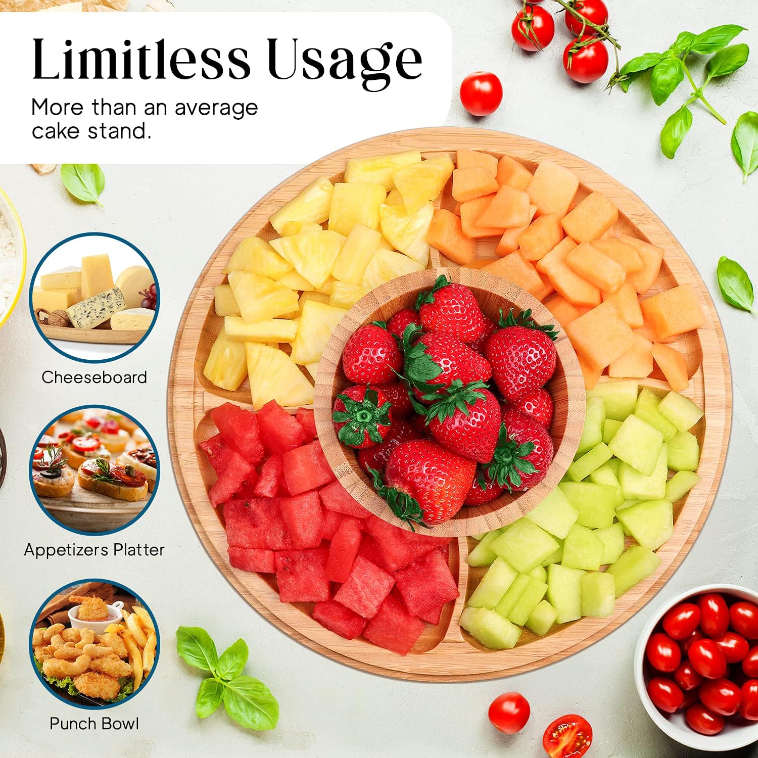 - MULTIFUNCTIONAL – This 6 in 1 multipurpose bamboo cake stand with dome is a unique cake stand with many functions and uses. Use it as a cake plate, cake tray, serving dish, punch and salad bowl, chips and salsa plate, and baking goods stand. Simply invert the dome or plate to create any type of serving dish. This spacious 12-inch cake stand with dome lid is designed to display bakes up to 4 inches tall.