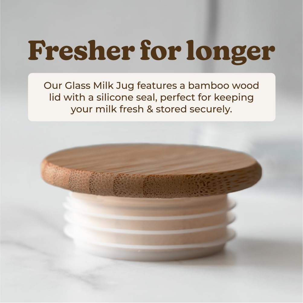 - Enjoy Delightful Milk Every Time - Wave hello to better milk with our milk bottles with lids for fridge. Unlike your regular milk carafe or big bottle glass, this reusable milk bottle features a wooden cap with a silicone seal to keep your milk fresh and avoid spillage.