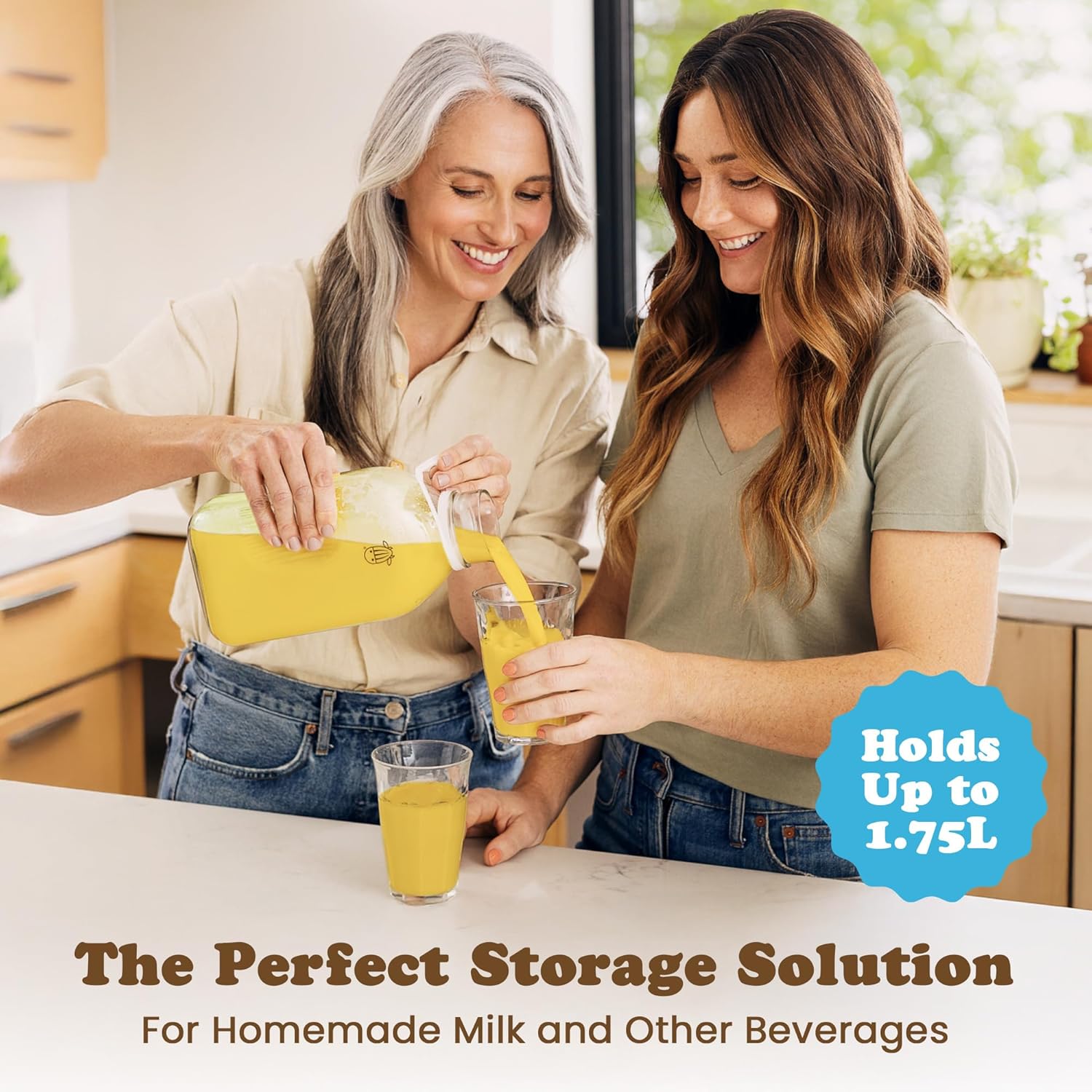 - The Perfect Milk Jar for the Entire Family - This glass pour bottle holds up to 60 fl oz or 1.75 liters of milk, juice, and other beverages. You can conveniently place your sleek, minimalist glass pitcher with lid inside your fridge or on your kitchen counter.