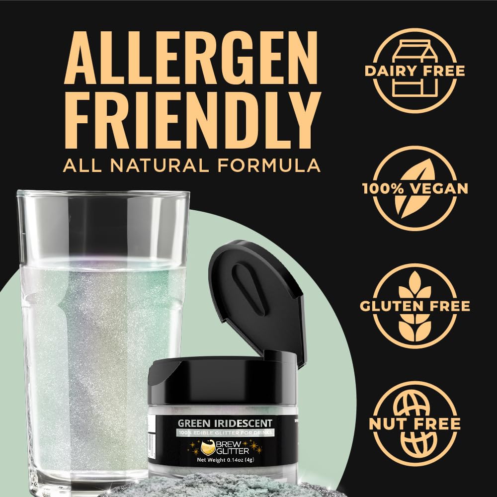 - 🌿 Brew Glitter iridescent green drink glitter is made in the USA at SQF III, GMP, Halal, and Kosher certified facilities, and is nut-free, gluten-free, and vegan.