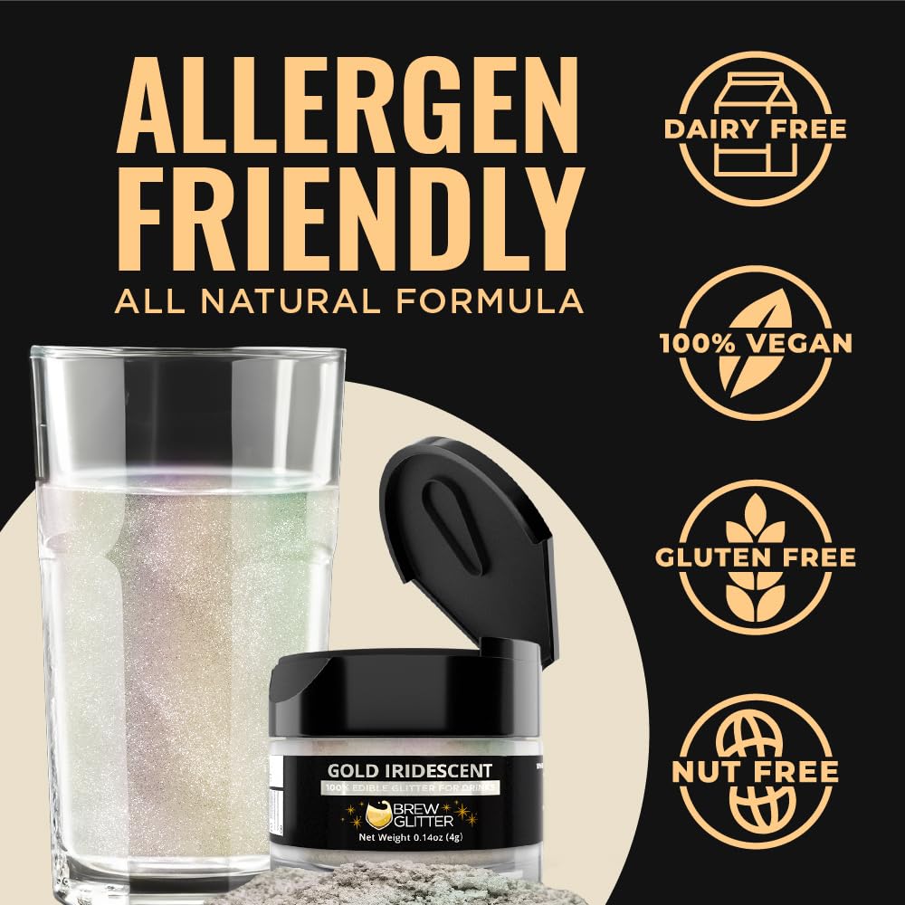 - 🌿 Brew Glitter iridescent gold drink glitter is made in the USA at SQF III, GMP, Halal, and Kosher certified facilities, and is nut-free, gluten-free, and vegan.
