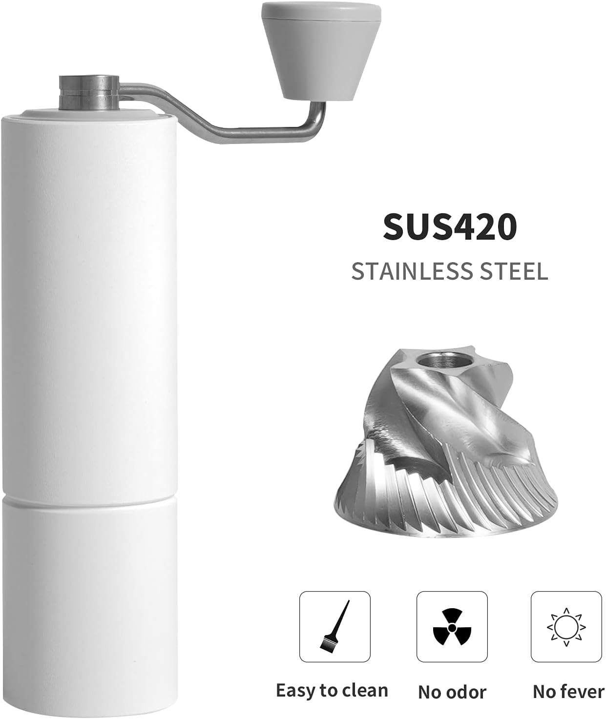 - [ Easy Clean & Carry ] Coffee grinder body weighs 700g, while maintaining a lightweight and a moderate sense of weight and luxury. It is ideal not only for home use but also for carrying outdoors or traveling. Easy to disassemble for cleaning - just be cleaned by brush