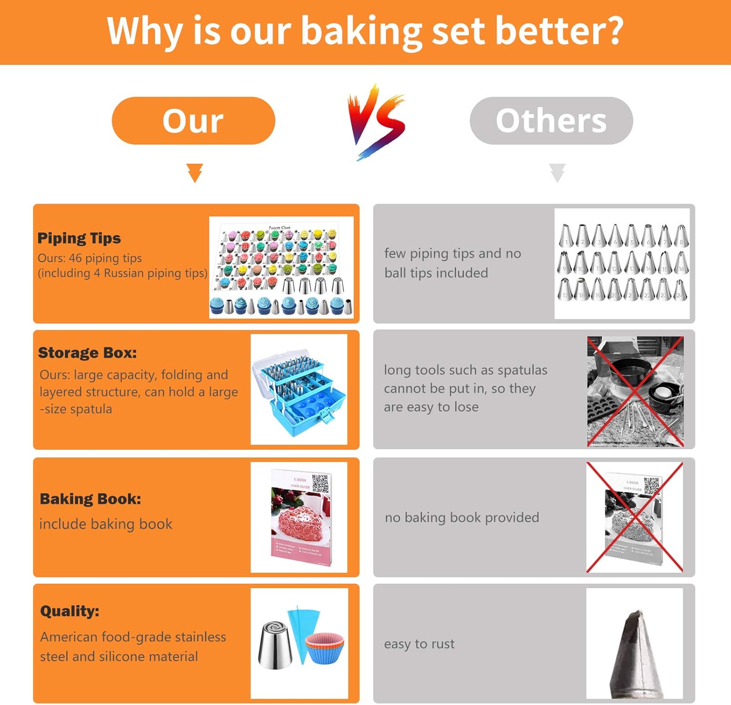 - Complete Baking Supplies - A nice set includes everything you need to start baking and decorating cakes! 1* blue storage box; 1* 36 numbered pattern chart; 100* disposable baking cups; 1* 12 inches TPU piping bags; 50* medium disposable piping bags; 3* scrapers; 8* fondant decorating tools; 2* cable ties; 1* silicone piping pen; 1* 6 inches spatula; 1* cake flower lifter; 2* cake flower nails; 6* silicone baking cups; 1* cleaning brush; 2* small couplers; 1*chocolate bomb mold