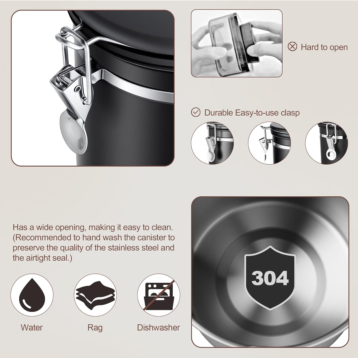 - 【STAINLESS STEEL COFFEE CONTAINER】Made from high-quality 304 stainless steel, the opaque body creates an ideal environment for storing coffee beans. The canister blocks out light and moisture to protect your ingredients—whether they’re coffee beans, dried nuts, or other pantry staples.Its robust construction offers long-lasting durability.