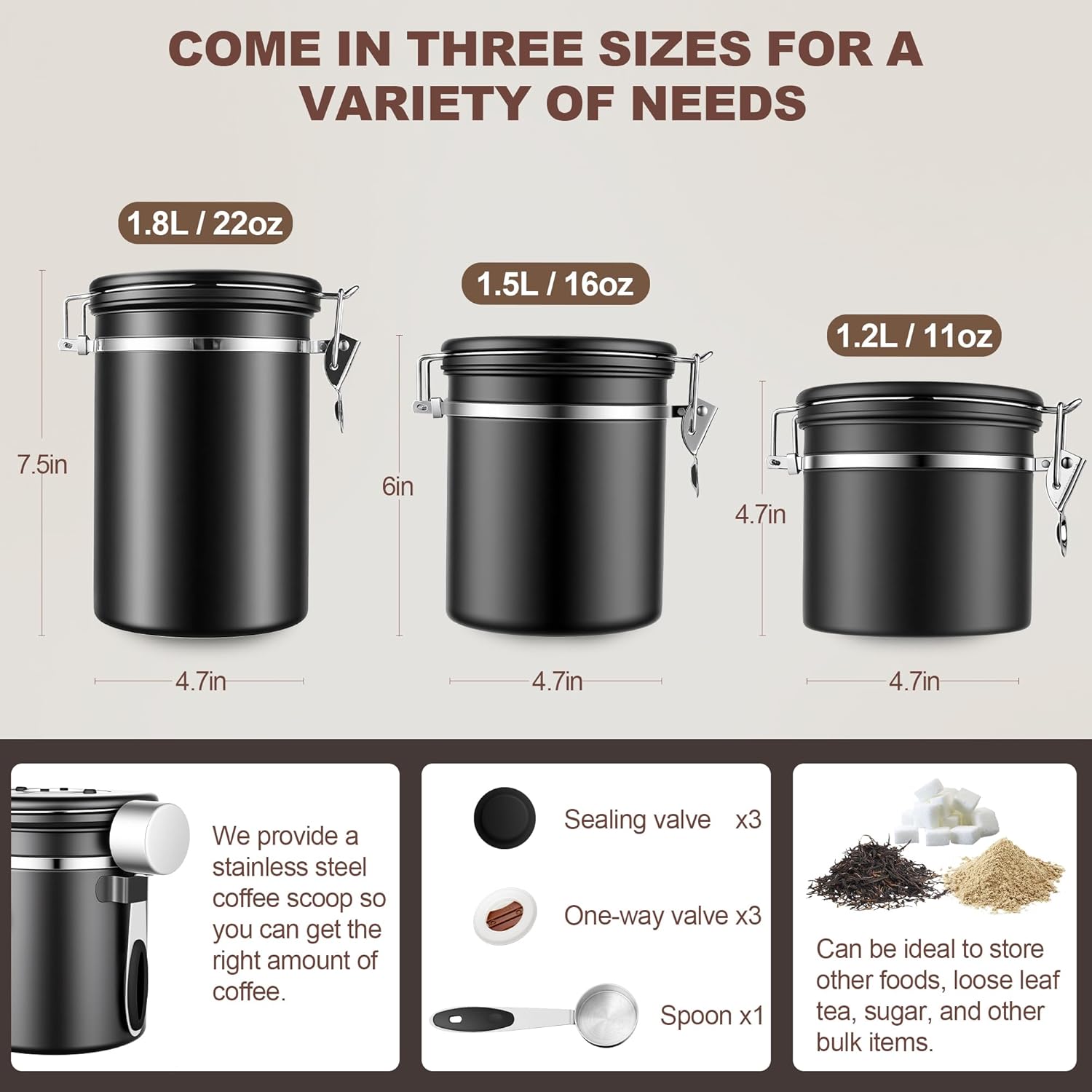- 【STAINLESS STEEL COFFEE CONTAINER】Made from high-quality 304 stainless steel, the opaque body creates an ideal environment for storing coffee beans. The canister blocks out light and moisture to protect your ingredients—whether they’re coffee beans, dried nuts, or other pantry staples.Its robust construction offers long-lasting durability.