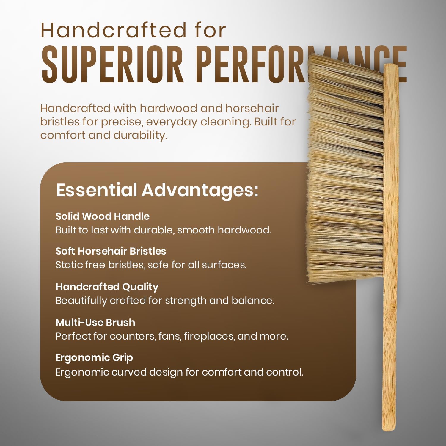 - ❄𝐇𝐈𝐆𝐇-𝐐𝐔𝐀𝐋𝐈𝐓𝐘 𝐍𝐀𝐓𝐔𝐑𝐀𝐋 𝐇𝐀𝐑𝐃𝐖𝐎𝐎𝐃➨ Our cleaning brush is made of high-quality natural hardwood, this dusting brush handle is highly resistant to break and durable to use. Never worry it will get out of shape with high-quality soft horsehair bristles, this bench brush is definitely static-free and won't make any scratching while dusting