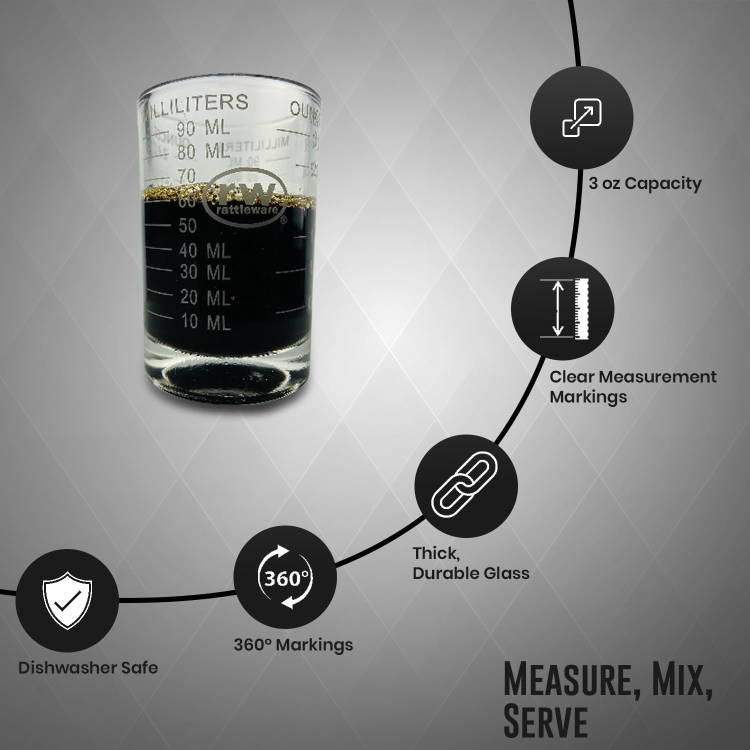 - 𝐃𝐔𝐑𝐀𝐁𝐋𝐄 𝐀𝐍𝐃 𝐒𝐓𝐘𝐋𝐈𝐒𝐇 𝐆𝐋𝐀𝐒𝐒: These Rattleware 3 oz measuring shot glasses are crafted from thick, premium glass for durability and clarity. Perfect for coffee bar accessories, bar carts, or gatherings, they add elegance to espresso cups, shot glasses, and bar accessories collections.