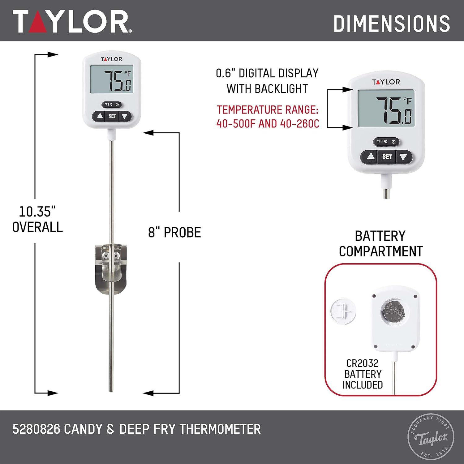 Taylor Programmable Digital Candy and Deep Fry Thermometer with Green Light Alert Display, Long Stem, and Adjustable Pan Clip, White