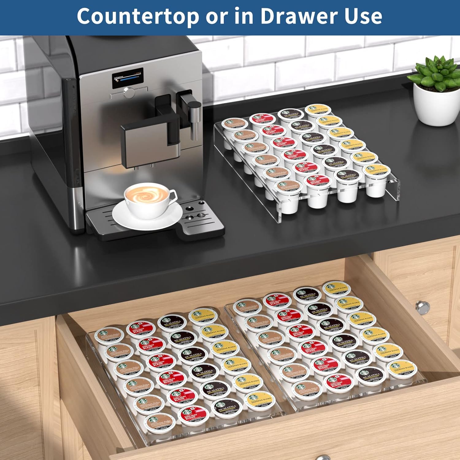 - 【Countertop or in Drawer Use】This k cup organizer tray can be used on the countertop or in the drawer. You can store coffee capsules next to your favorite coffee machine, which is convenient and quick to take. We have designed 24 holes, each hole corresponds to a K cup capsule, you can clearly see the taste of the K cup capsule. Transparent K cup coffee pod holder can be used in offices, counters, and kitchens.