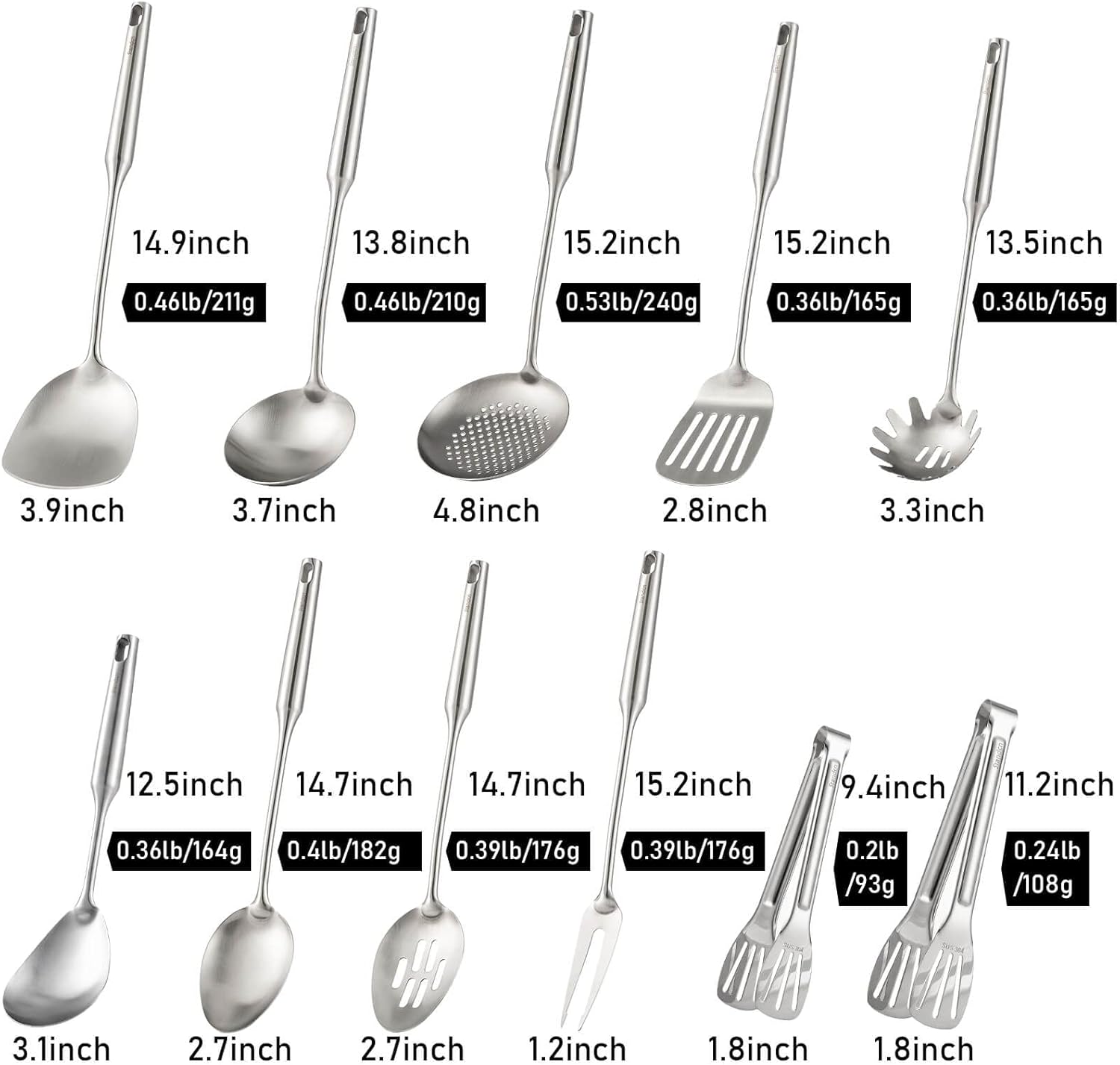 - HIGH QUALITY COOKING UTENSILS SET: Made of heavy-duty 18/10 stainless steel(Highest grade in 304) . Forged in one-piece, sturdy and durable. Forged in one-piece with no welding or stress points, sturdy and durable. Fine silver matte brushed(2 tongs are mirror polished), unique shape and style. A complete complement to carbon steel, cast iron woks.etc