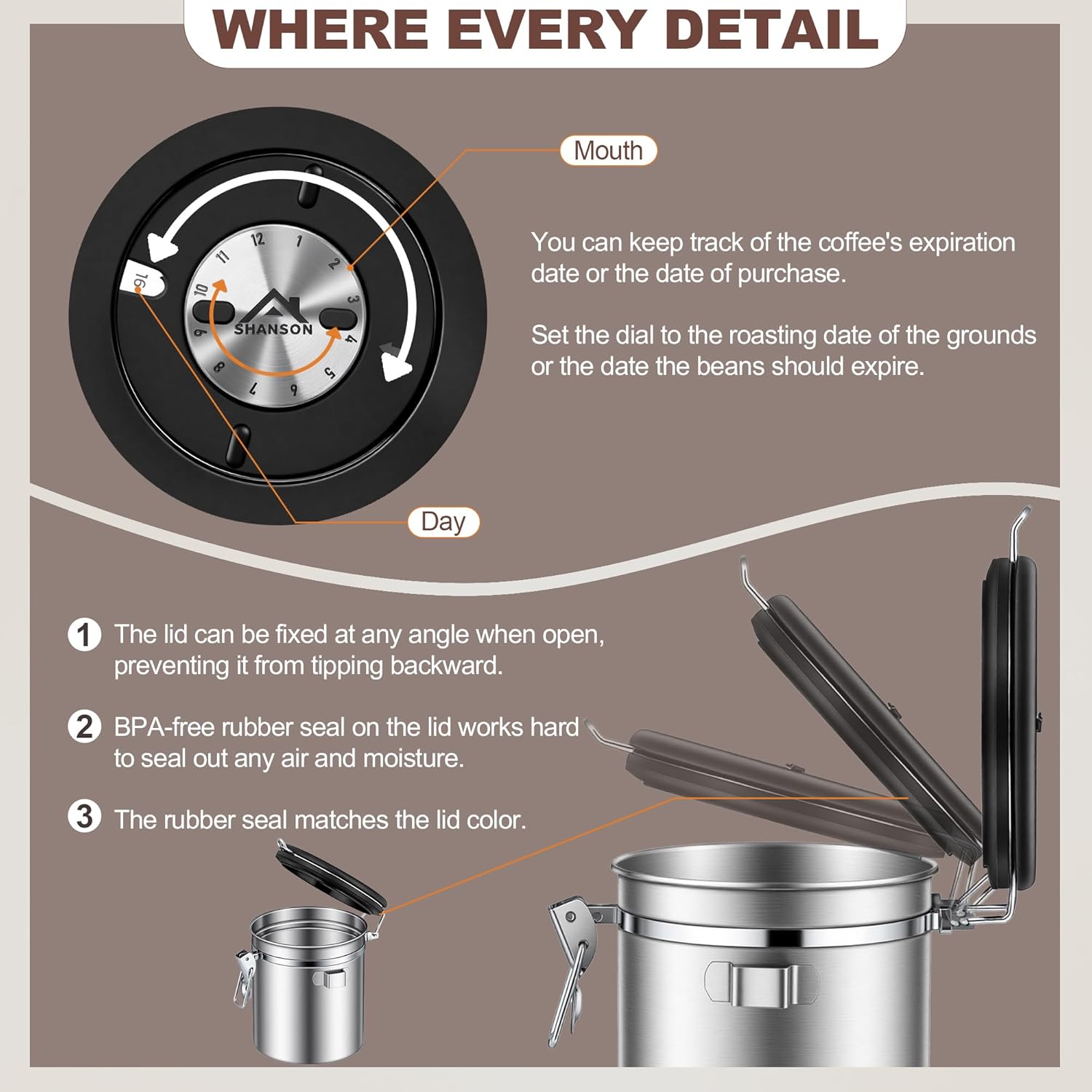- 【BUILT-IN DATE TRACKER】A simple yet incredibly useful feature! The date tracker lets you monitor when the canister was last filled, helping prevent your coffee from going stale unnoticed. A stainless steel scoop is conveniently attached to the side, so you’re never left searching for a measuring spoon. Features a superior airtight seal for maximum freshness.