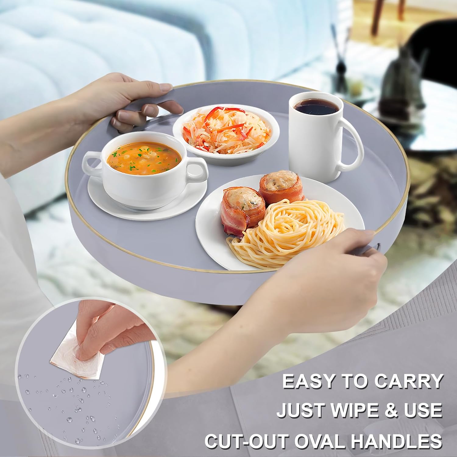 - PLASTIC SERVING TRAY: Round serving tray provide a stable surface for plates, cups, and utensils, making it easier to carry and enjoy your meal without spills. Not only can it be used as a breakfast tray for enjoying breakfast in bed, but it also be used as a perfume tray, bathroom vanity tray, jewelry tray, accessory tray and makeup tray.