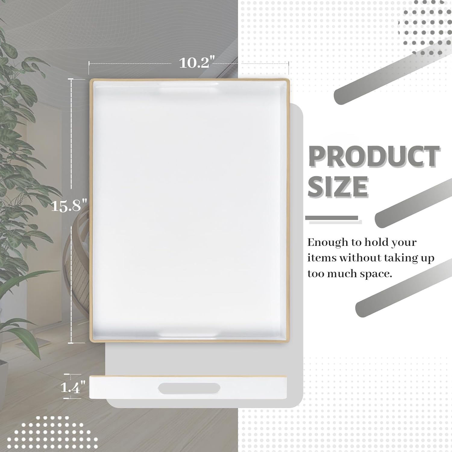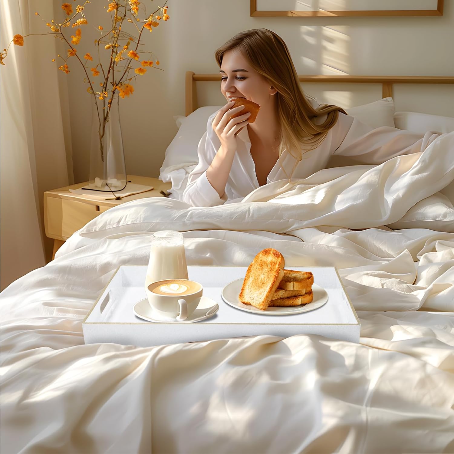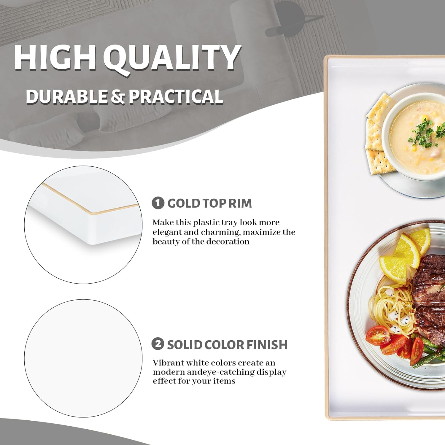 - TRAY DECOR: White tray is often used to present food and drinks in an appealing and organized manner. Rectangle tray can enhance the visual appeal of the items being served, making them more enticing to guests or customers. Also place it on your bathroom vanity as an exquisite showcase for perfumes, jewelry, or bath accessories.
