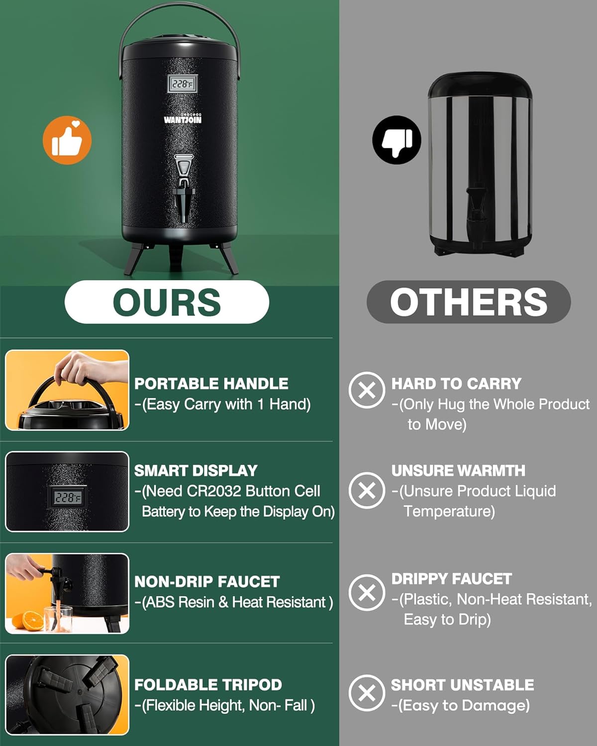 - Visual Themometer : It is a NON—HEATING FUNCTIONAL insulated beverage dispenser. Designed with a real-time monitoring LCD temperature display screen, convenient the reading of hot beverage dispenser thermometer. No matter what the occasions are, our instant read thermometer makes for an essential kitchen gadget. You can easily dispenser everyone’s favorite drinks at just the right temperatures.
