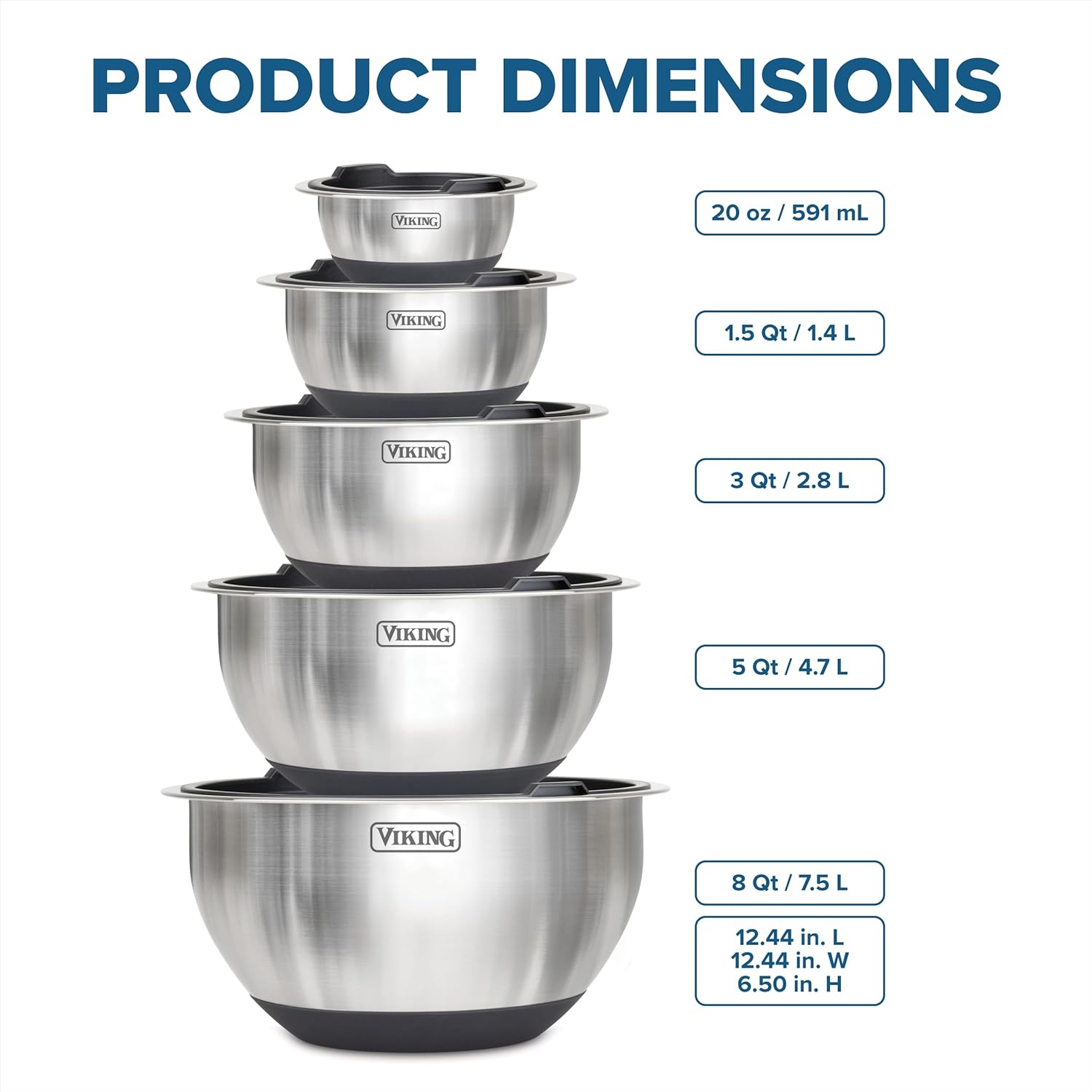 - 10 PIECE MIXING BOWL SET: Elevate your home kitchen and experience culinary precision with our Viking 10-piece Stainless Steel Mixing Bowl Set! This stylish and versatile mixing bowl set includes a 20-oz, 1.5 qt, 3 qt, 5 qt and 8 qt bowl, each with a tight fit lid to seal in liquids and odors