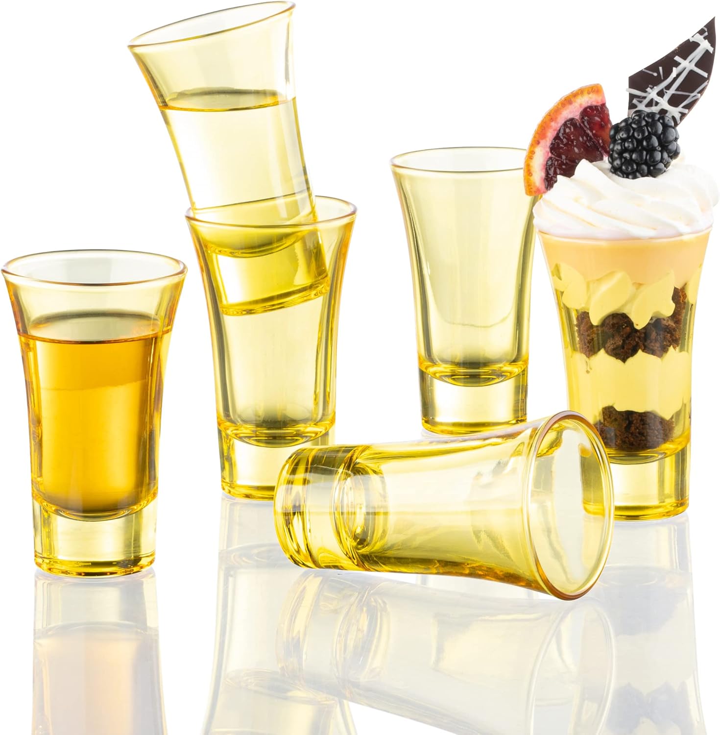 - Yellow Shot Glasses- Set of 6 fully colored yellow shot glasses. 2 Oz capacity shot glass, the perfect size for mixing cocktailsand a double shot. 3.4" High x 2" Diameter. Solid seamless design that is easy to hold and drink from. Each glass is individually wrapped to ensure a hassle free experience.