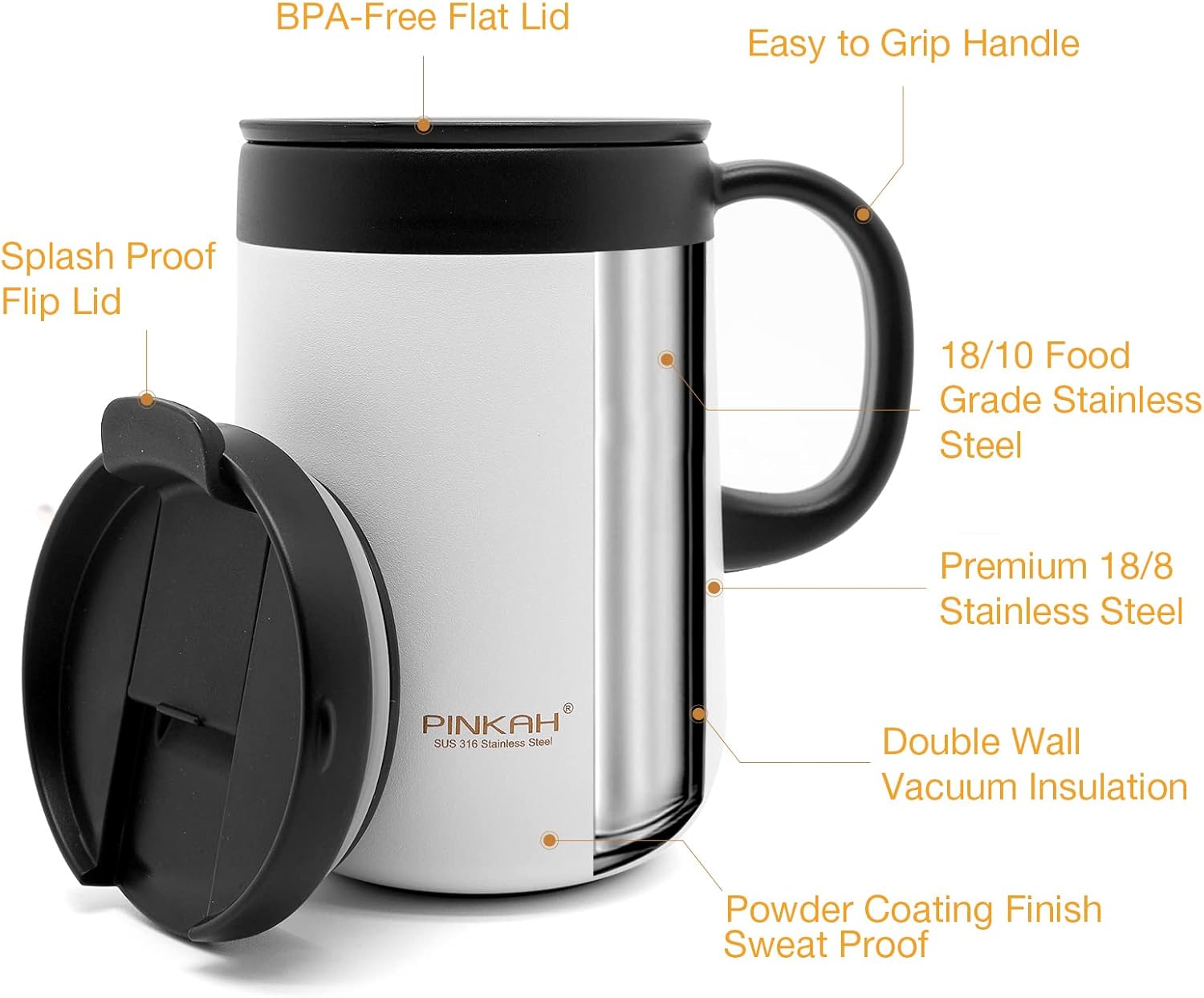- Vacuum Insulated Coffee Mug with Handle: It is provide with double-wall vacuum insulation. Make sure the beverage is kept warm up to 6 hours or cold up to 8 hours.