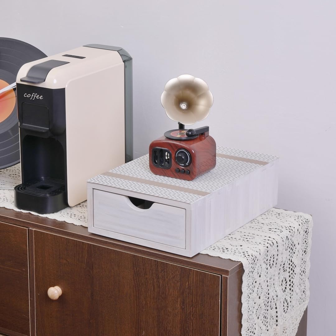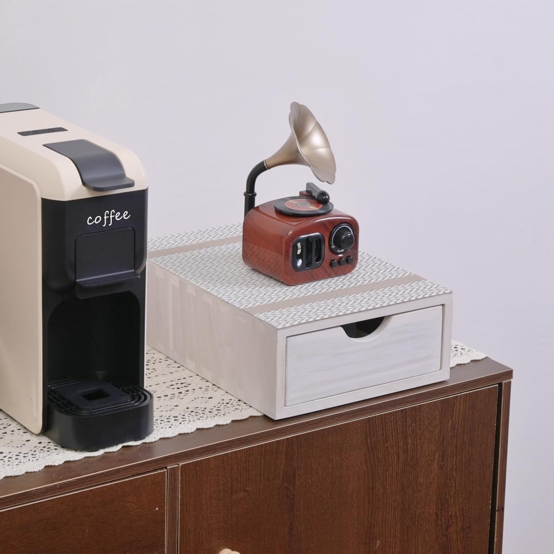 - [MULTI-USAGE CADDY] The wooden table organization is functional and Multi use. In Kitchen ,it fits coffee brew station on the box roof and stores cutlery like knives and forks,or holds coffee pods,k cups,tea bags,milky tea in sliding drawers;In Office, it is suitable for coffee accessories as coffee servings sorter too,besides,also be used as desk organizer for office supplies and act as a small fax printer stand.