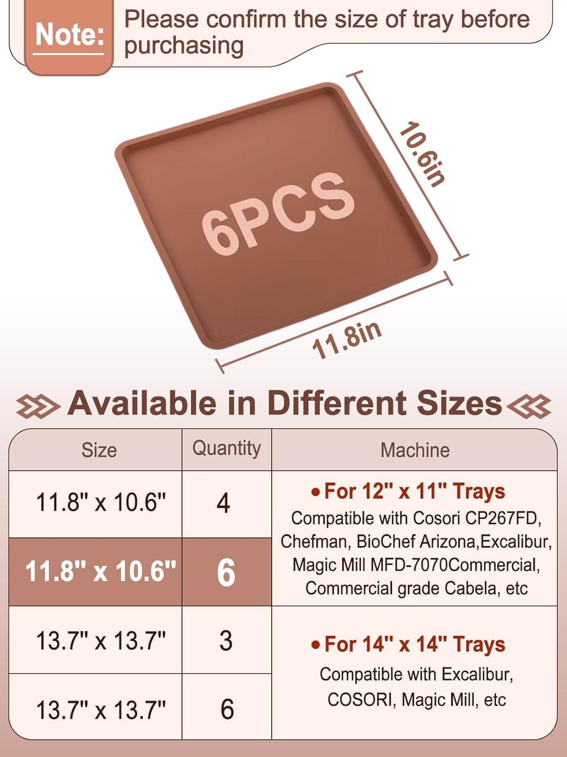 - Perfect Size: Our silicone tray liner measures 11.8'' × 10.6'', suitable for 12'' × 13'' metal trays, also compatible with Cosori CP267-FD, Chefman, BioChef Arizona, Magic Mill MFD-7070 Commercial, Excalibur, commercial grade Cabela and more. Tip: The size of the metal tray cannot be smaller than that of the silicone mats.