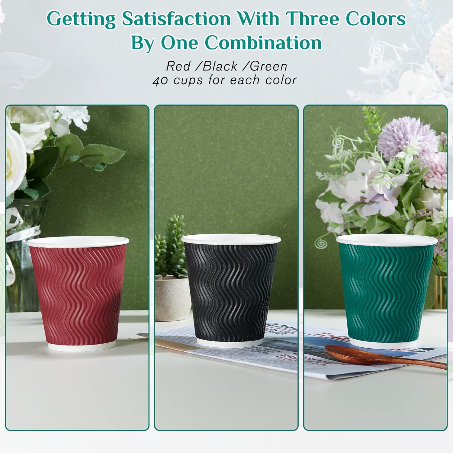 - Package: 120 pack insulated paper coffee cups with 3 colors (red, black, green) is a great deal. Classic and elegant design make these hot coffee cups versatile, perfect for daily or office use, as well as for business use in cafe shops or restaurants