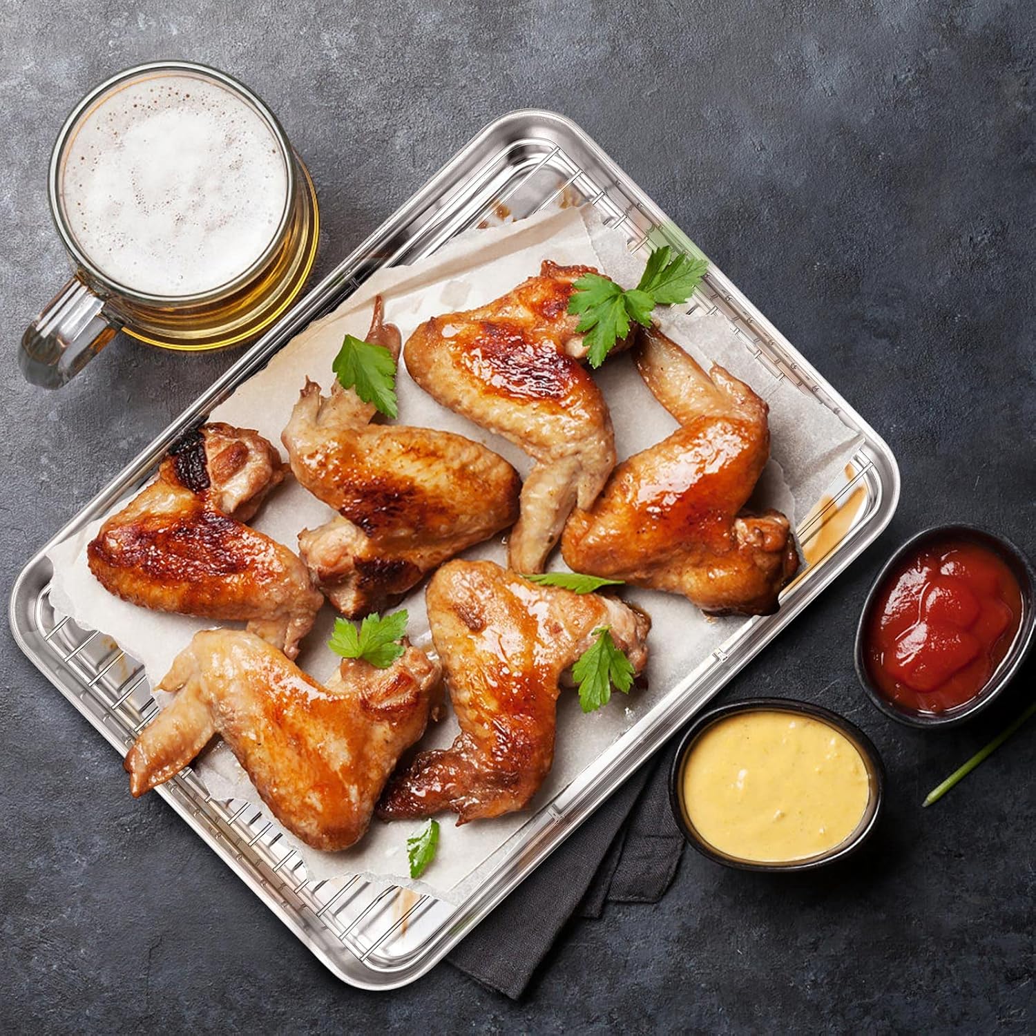 - 1 PAN + 1 RACK - Including 1 cookie sheet 12.4 x 9.7 x 1 inch and 1 cooling rack 11.6 x 9 x 0.6 inch, Fits most regular oven and large toaster oven, Work perfectly together and also can be used separately, Ideal for everything from baking and cooling cookies, pastries, and breads to roasting cuts of meats and vegetables