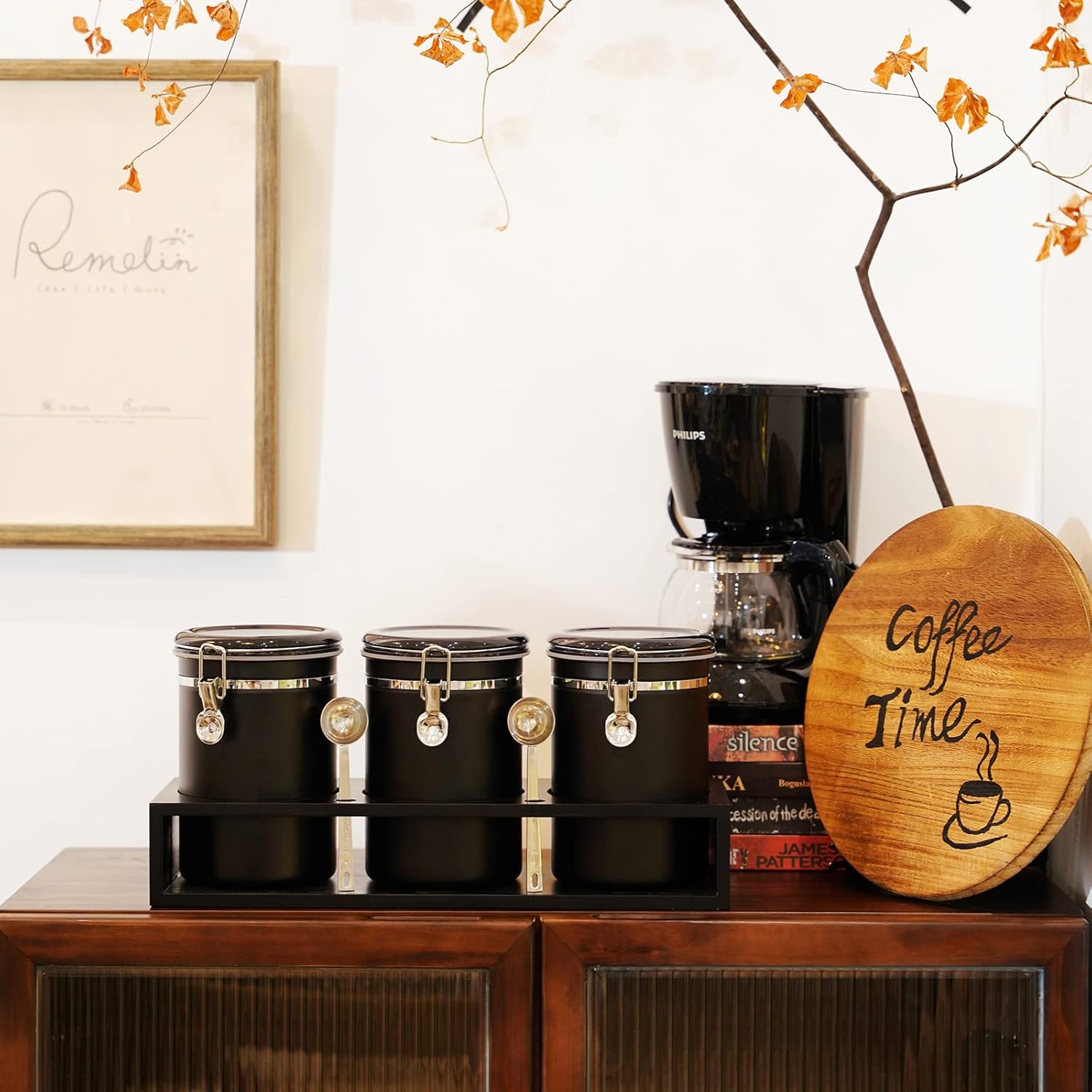 - KEEP THE DESKTOP TIDY: The coffee Containers set includes a wooden storage shelf and 2 Silver iron coffee spoon, which not only facilitates users to organize and categorize similar foods, make the desktop more tidy, and use the cans more conveniently, but also can decorate your desktop and let Your desktop is no longer monotonous.