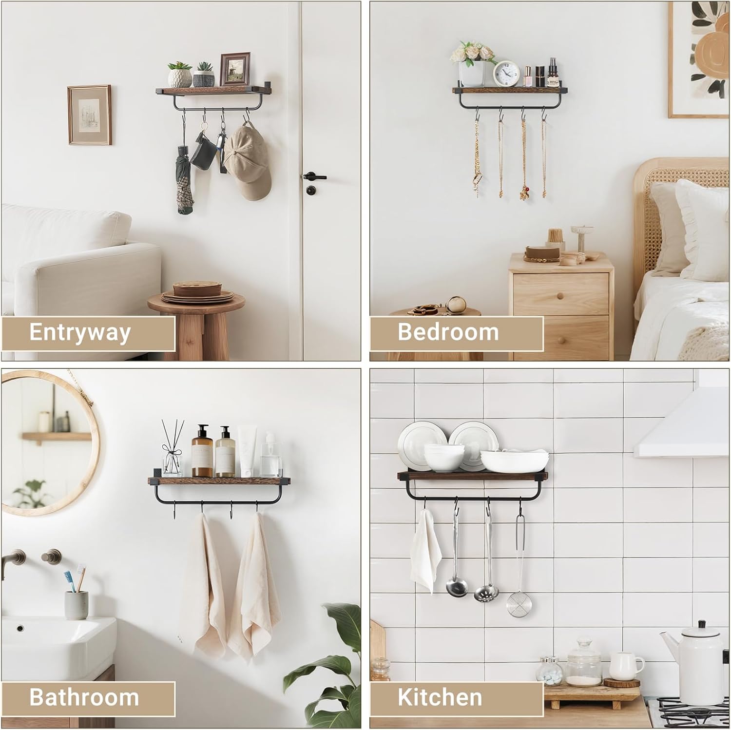 - Bathroom Shelf with Towel Rack: This verstile wall storage shelf can also be used as a bathroom shelves with towel bar and hooks. Educing the clutter at bathroom vanity and free up lots of counter space in your bathroom.