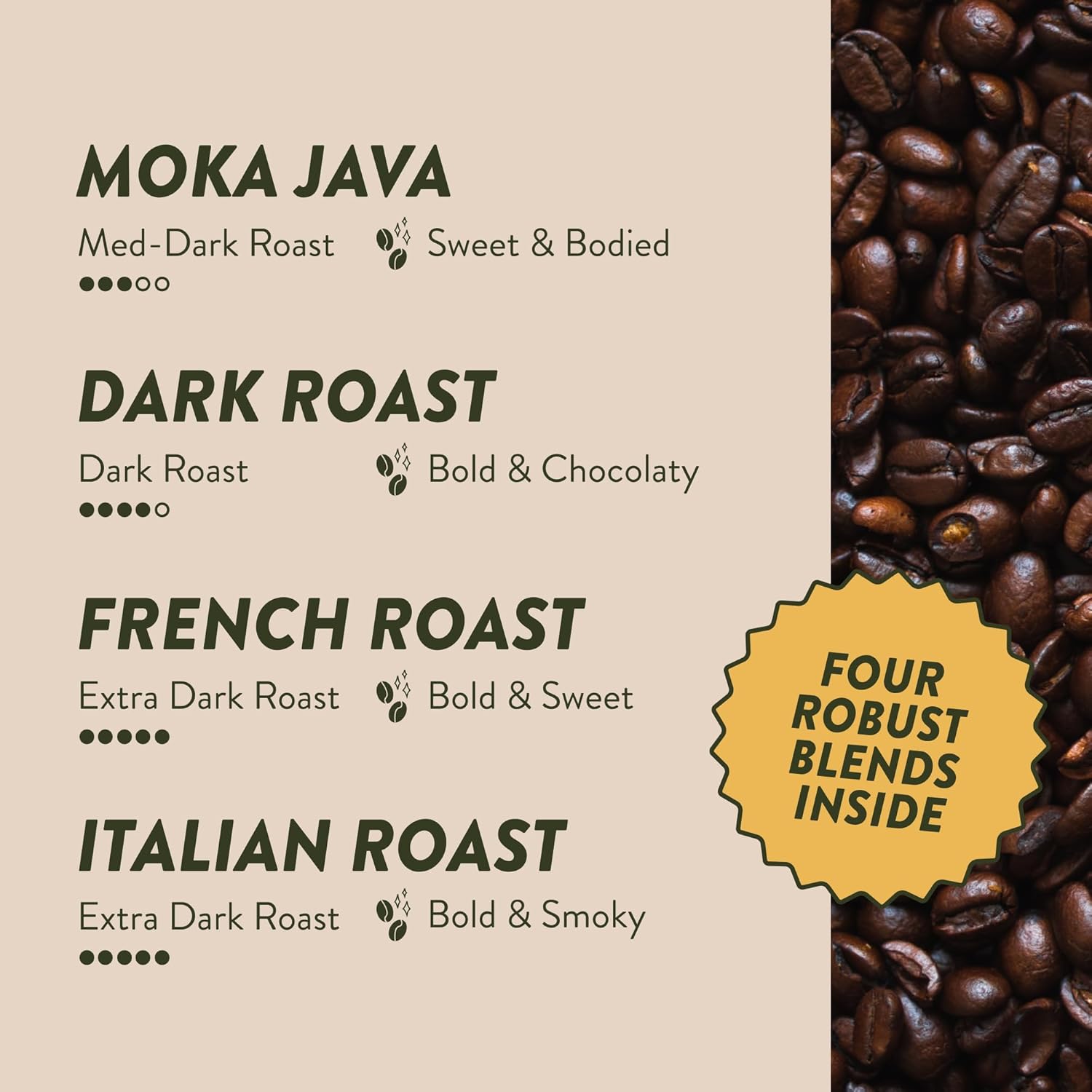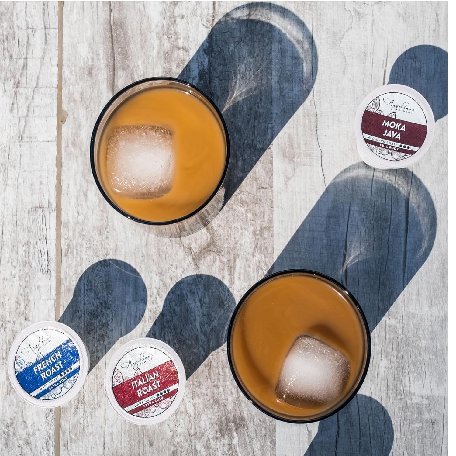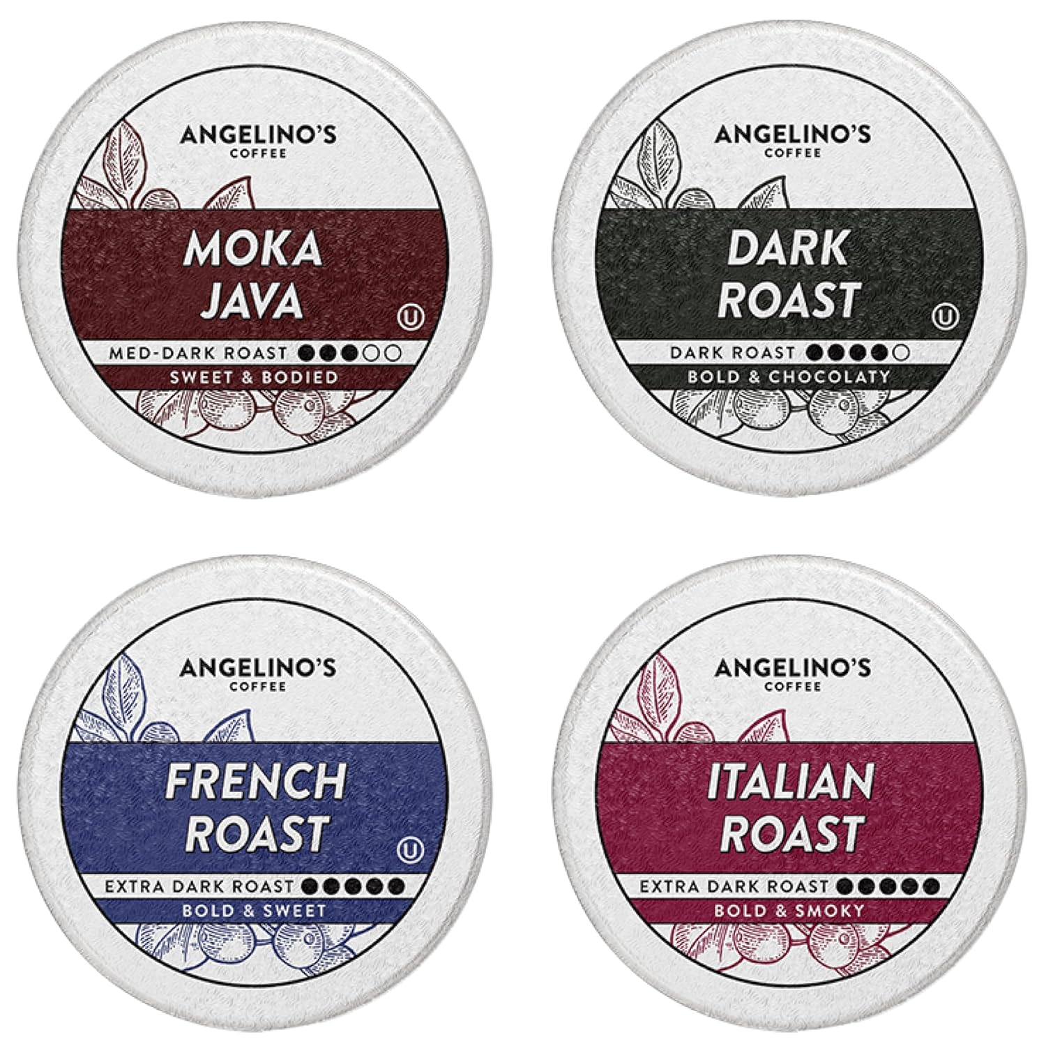 - INCLUDES: Angelino's Dark Roast Variety brings you 96 single serving Keurig K-Cup compatible pods. Inside are four 24ct boxes: Moka Java, Dark Roast, French Roast, Italian Roast.
