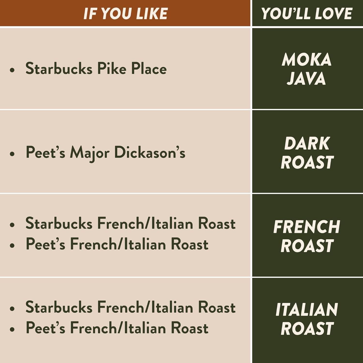 - COMPARE TO: Moka Java for those who like Starbucks Pike Place. Dark Roast for those who enjoy Peet's Major Dickason's. French Roast and Italian for those who enjoy smoky, woodsy coffees like Starbucks or Peet's French/Italian.