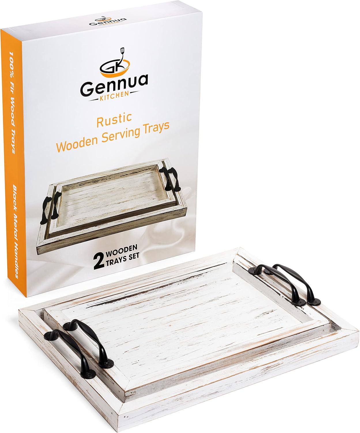 Rustic Serving Tray with Handles - 2 Nesting Trays for Serving Food - Wooden Tray for Decor, Coffee Table & Ottoman - Large Serving Tray with Distressed White Finish to Complement Any Decor