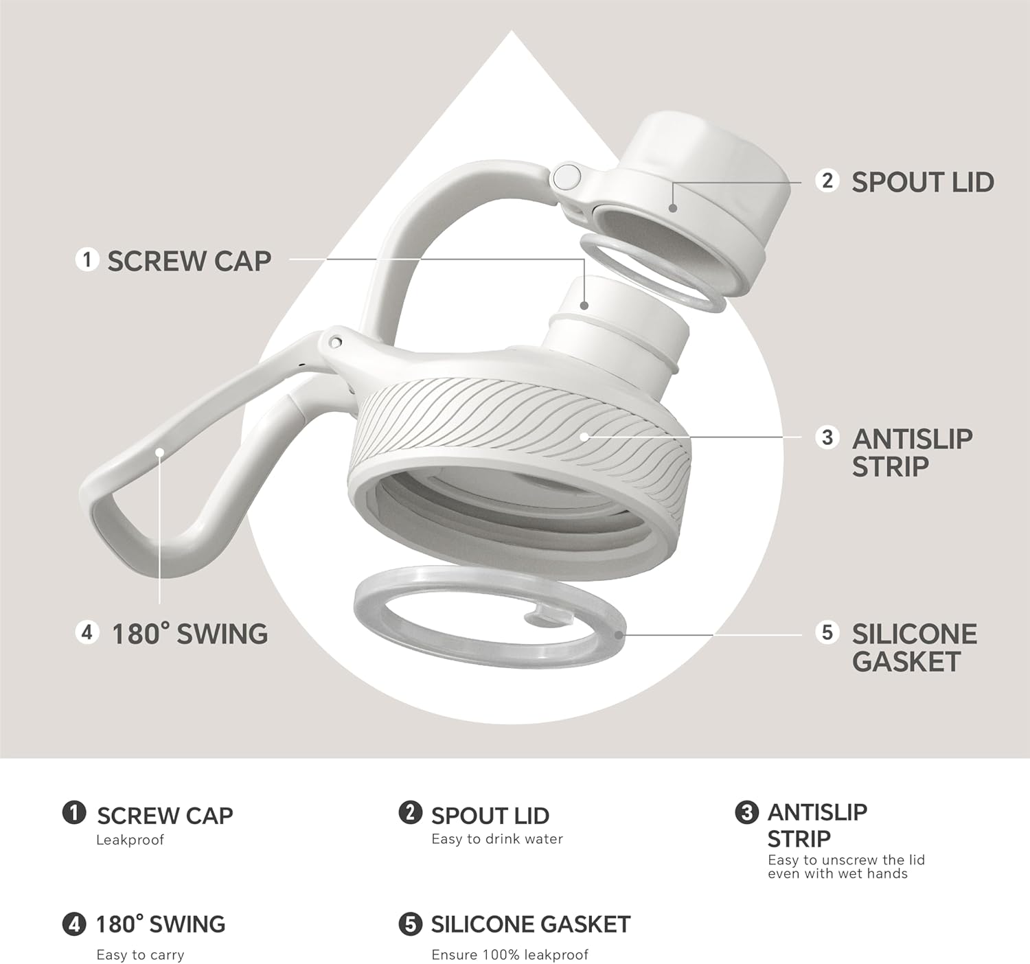 IDEUS Insulated Stainless Steel Water Bottle with 2 Leak-Proof Lids, Thermal Water Flask for Hiking Biking, 18oz, White