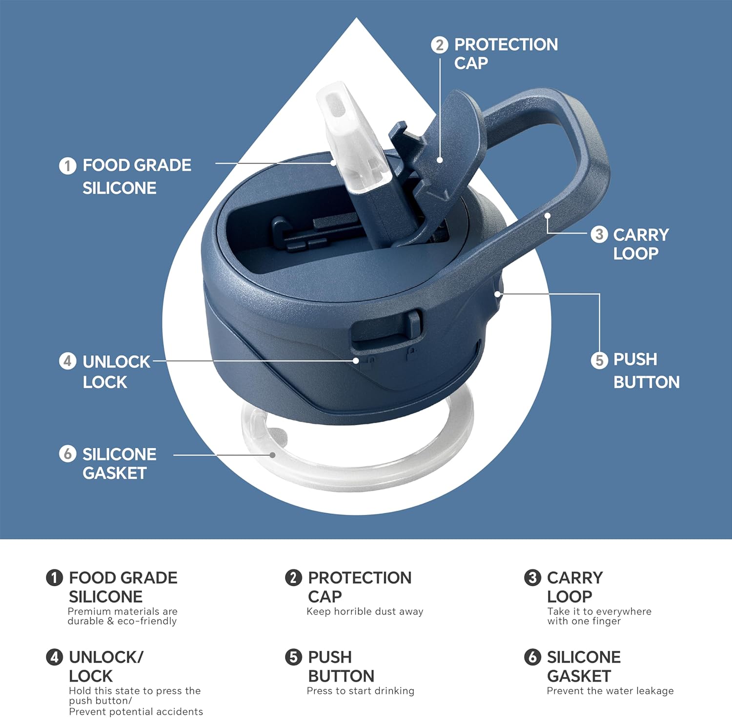 IDEUS Insulated Stainless Steel Water Bottle with 2 Leak-Proof Lids, Thermal Water Flask for Hiking Biking, 40oz, Navy Blue