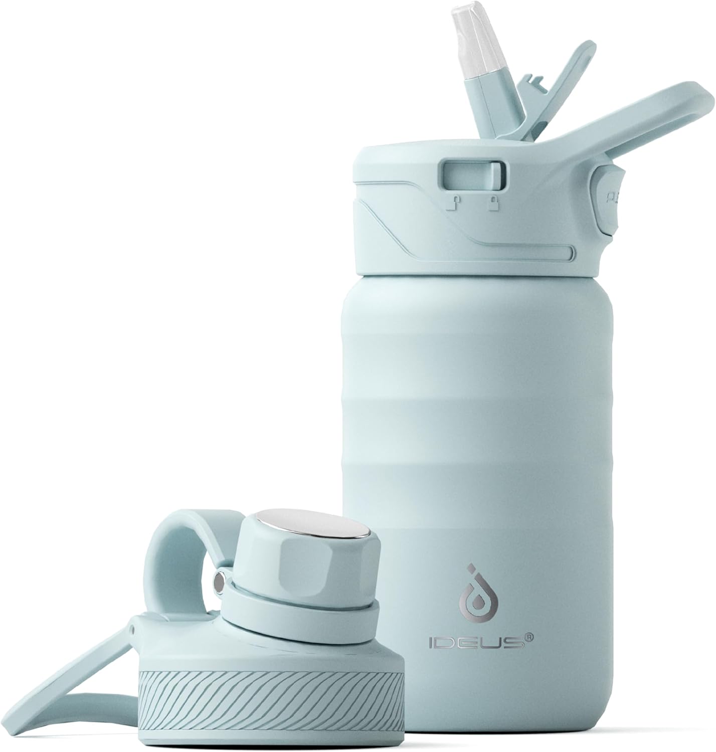 IDEUS Insulated Water Bottle 12oz, Stainless Steel Insulated Water Bottle For School, Insulated Bottles With Straws Leakproof, Vacuum Double Wall Water Bottles For Boys And Girls With 2 Lids, BPA Free