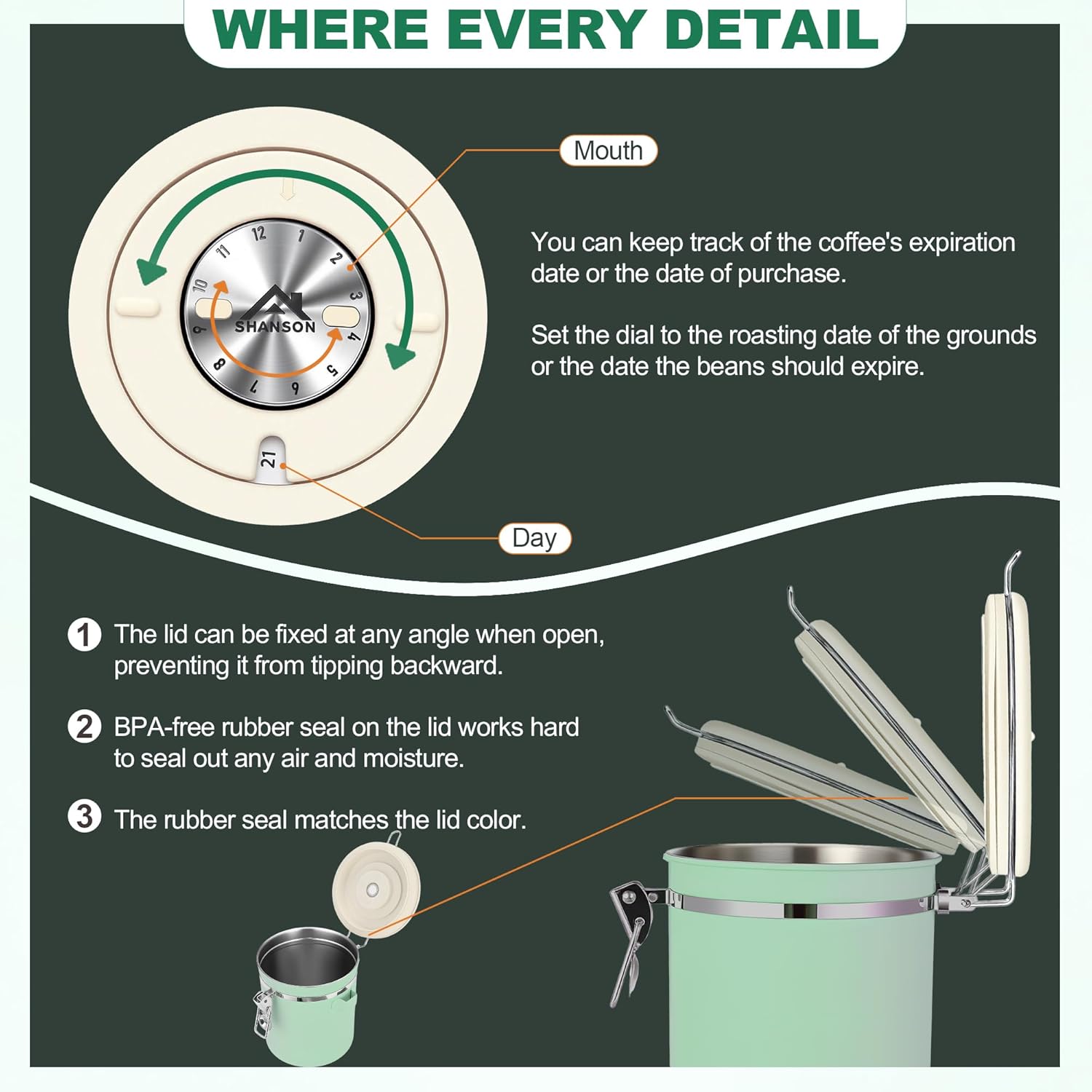 ShanSon Coffee Canister Airtight Coffee Container Stainless Steel Coffee Bean Storage Container with Scoop Coffee Canister for Beans Grounds Sugar Flour Tea Cereal,11OZ,Green