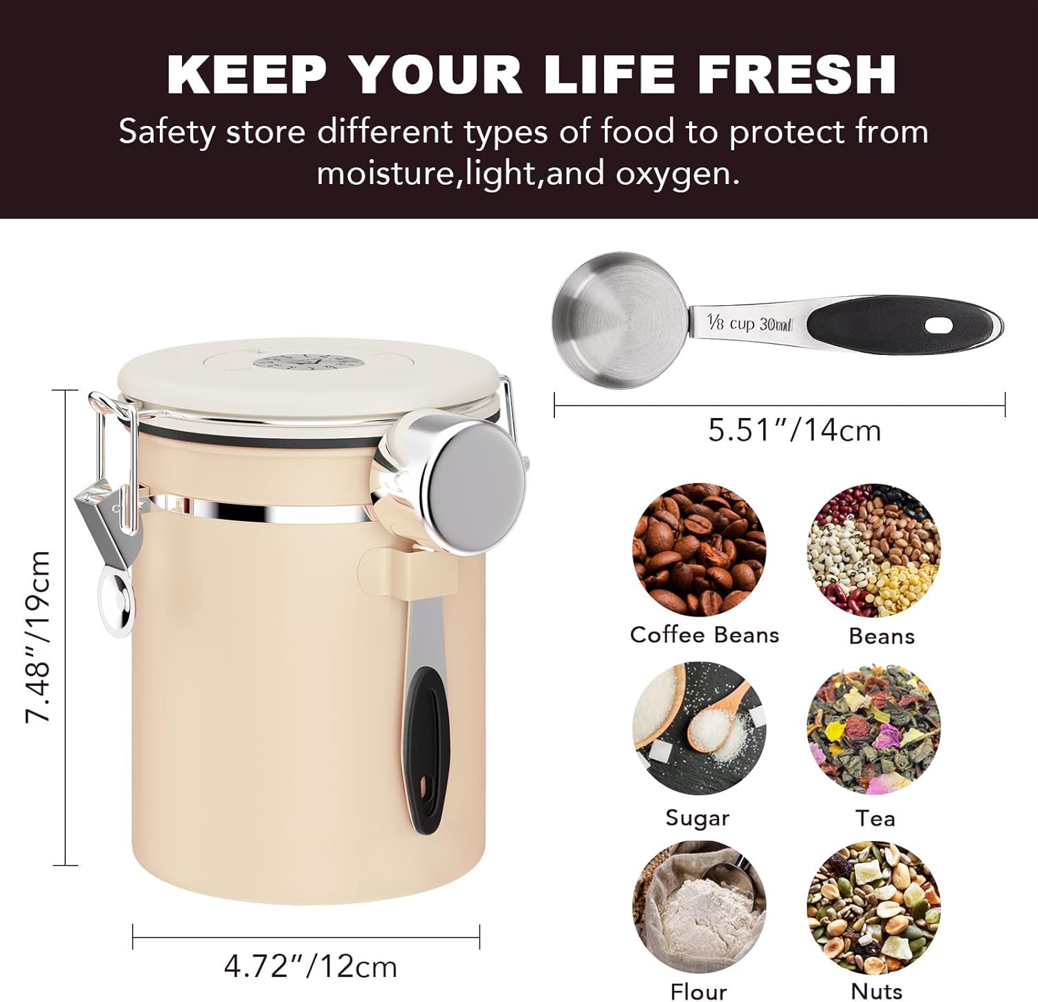 - 【BUILT-IN DATE TRACKER】A simple yet incredibly useful feature! The date tracker lets you monitor when the canister was last filled, helping prevent your coffee from going stale unnoticed. A stainless steel scoop is conveniently attached to the side, so you’re never left searching for a measuring spoon. Features a superior airtight seal for maximum freshness.