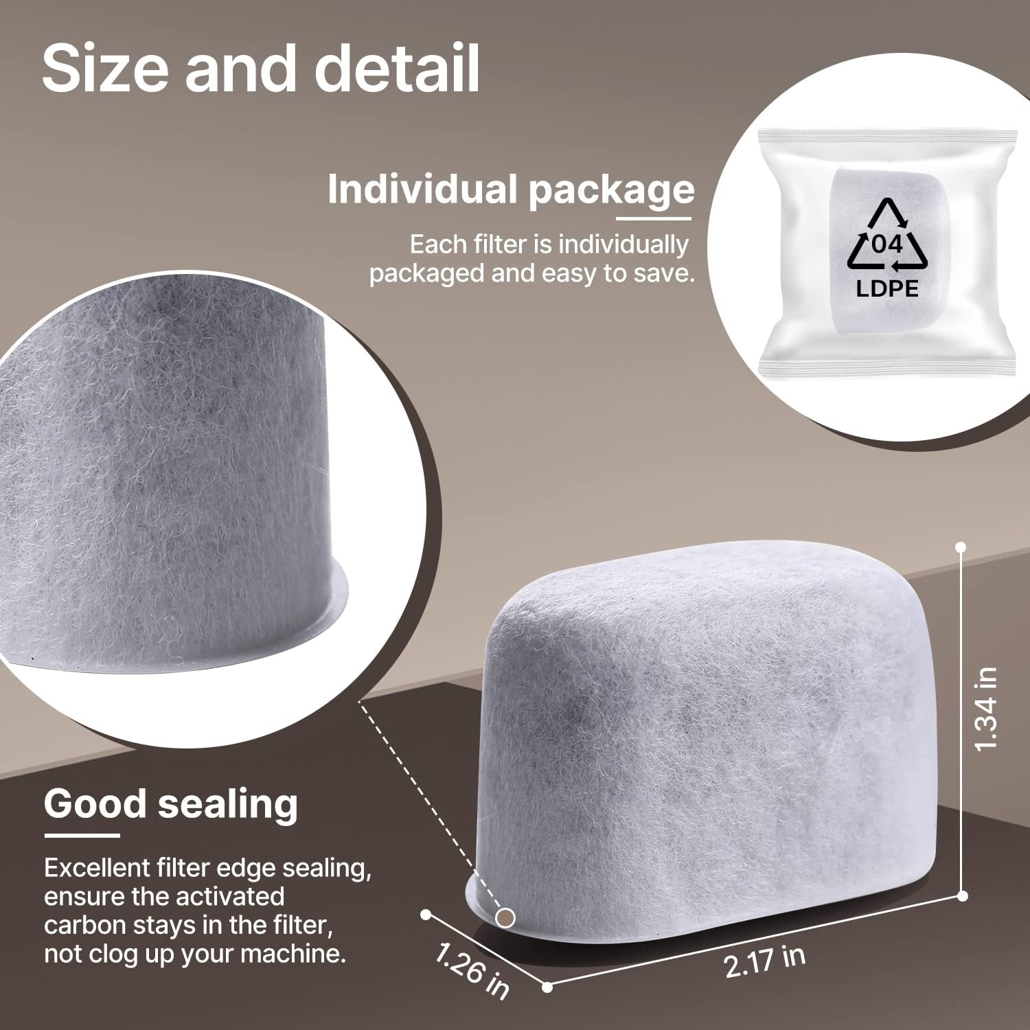 - Individually Sealed: Each filter is individually sealed for easy access and storage. Adopting an entirely new production process gives the filter excellent sealing performance. 100% ensures the charcoal stays in the filter and does not clog up your coffee machine.