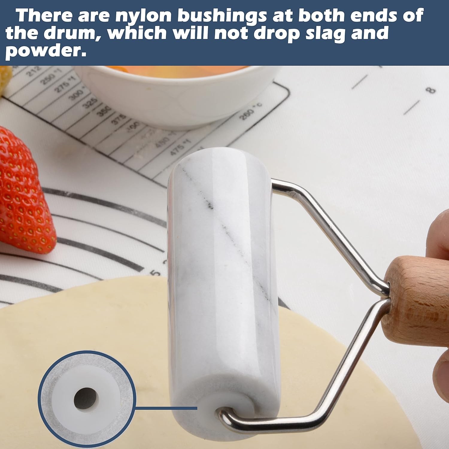 - 【Exquisite design and production process】Nylon bushings are installed at both ends of the marble roller, which is easy and labor-saving during use; at the same time, during the rolling process of the roller, the roller will not directly contact the marble, so as to avoid the marble slag and powder. Stainless steel metal frame, durable and not easily deformed. The beech wood handle is finely ground and polished for easy grip and a comfortable feel.