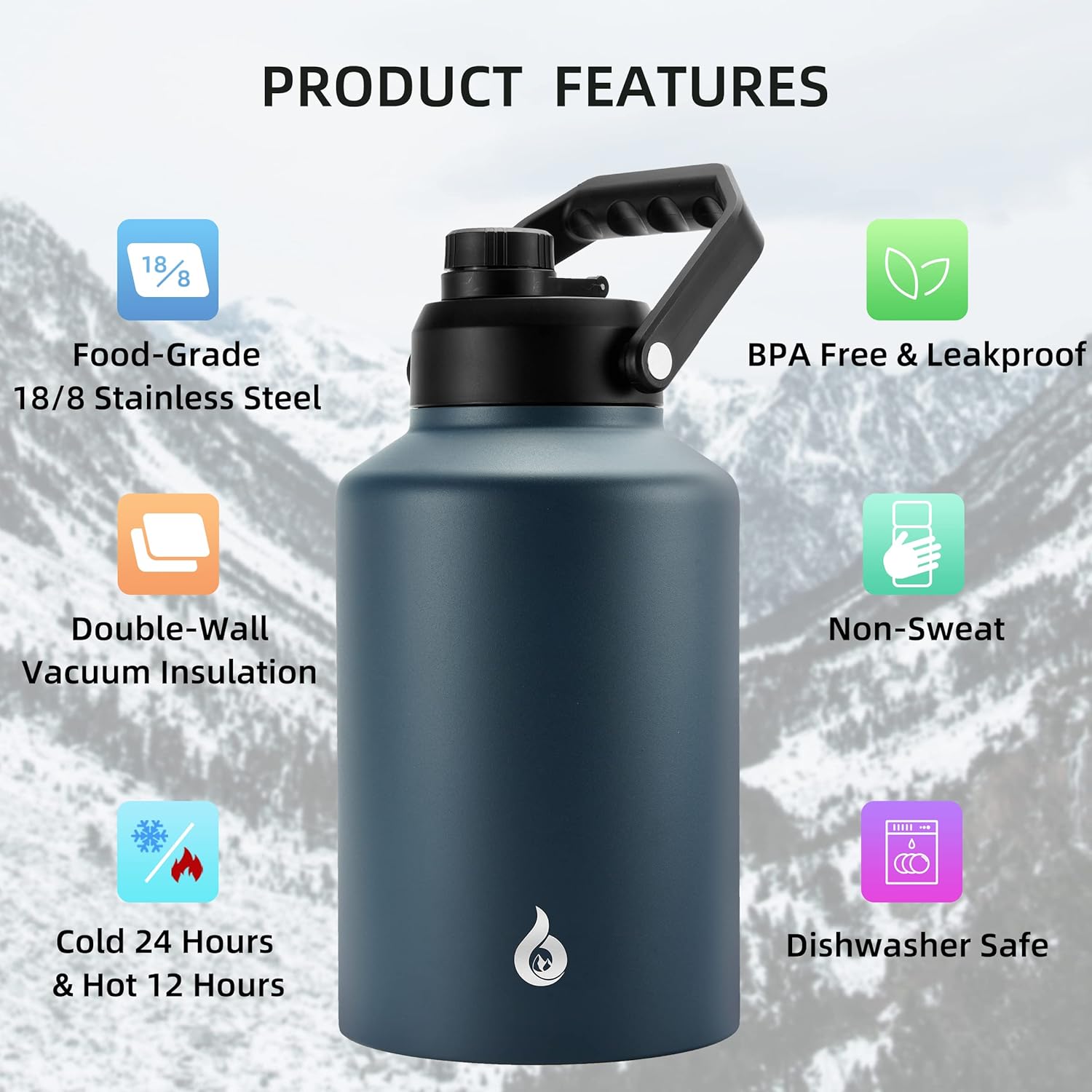 BJPKPK One Gallon(128 oz) Insulated Water Bottle, Dishwasher Safe Stainless Steel Thermos, BPA Free Jug with Ergonomic Handle & Anti-slip Bottom, Large Water Bottle, Navy Blue