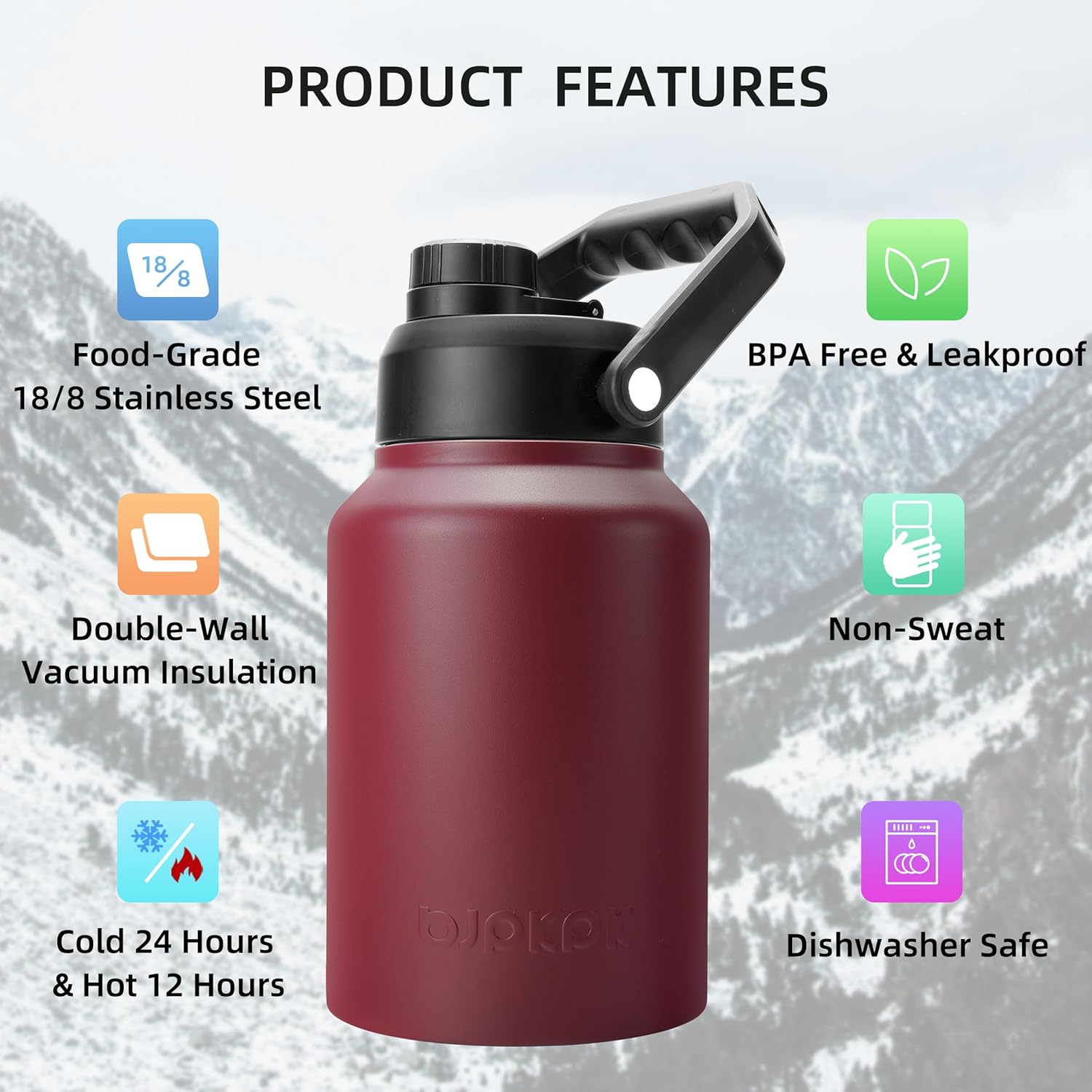 BJPKPK 64 oz Insulated Water Bottle, Dishwasher Safe Half Gallon Water Bottle with Ergonomic Handle, BPA Free Leak Proof Water Jug for Sports, Metal Thermos with Anti-slip Bottom, Brick Red
