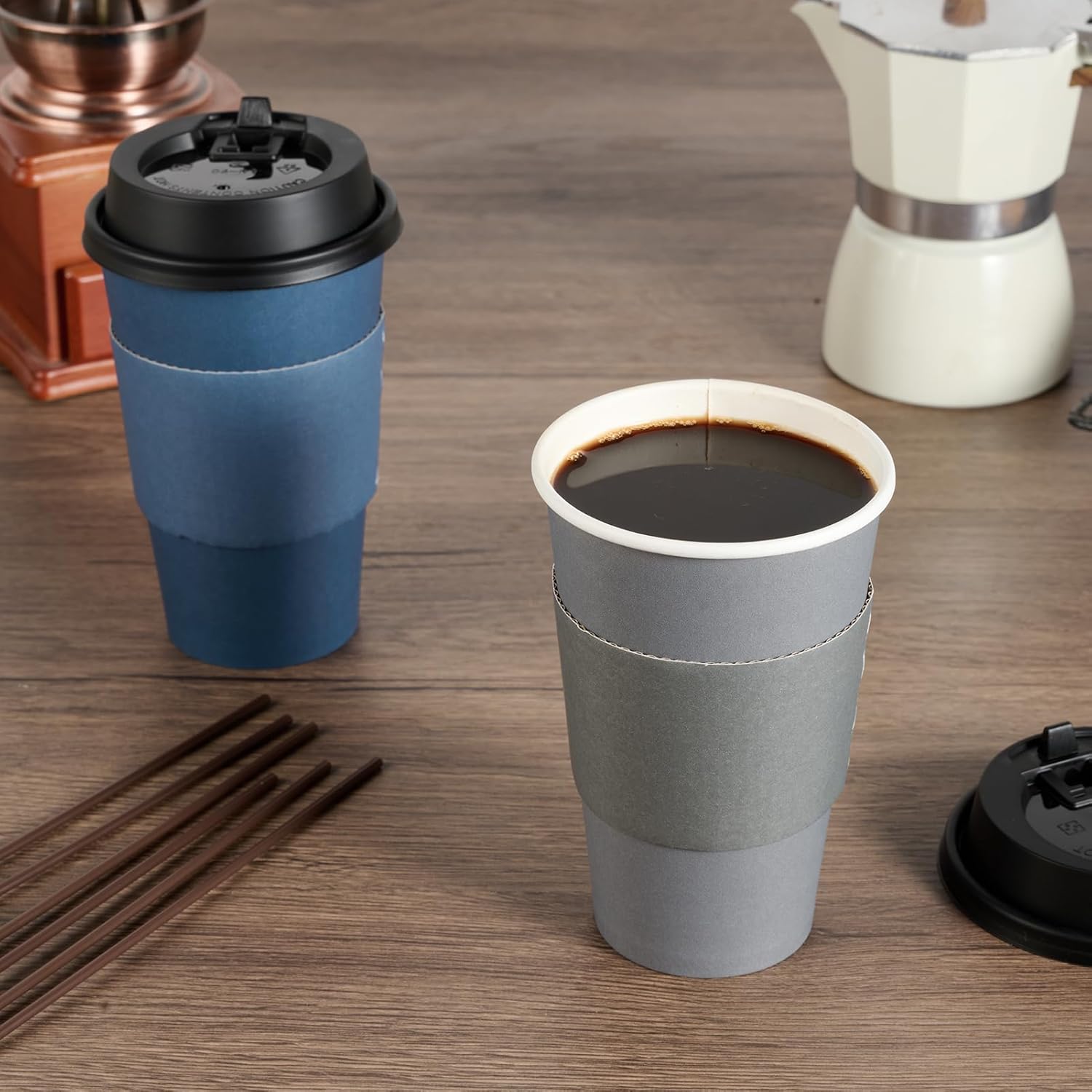 - Great Value Pack: You will receive a 16 oz value disposable paper cup including 50 packs of blue coffee cups and 50 packs of grey coffee cups, 50 blue cup sleeves, 50 grey cup sleeves, 100 packs of black matching lids, and 100 matching stirring sticks