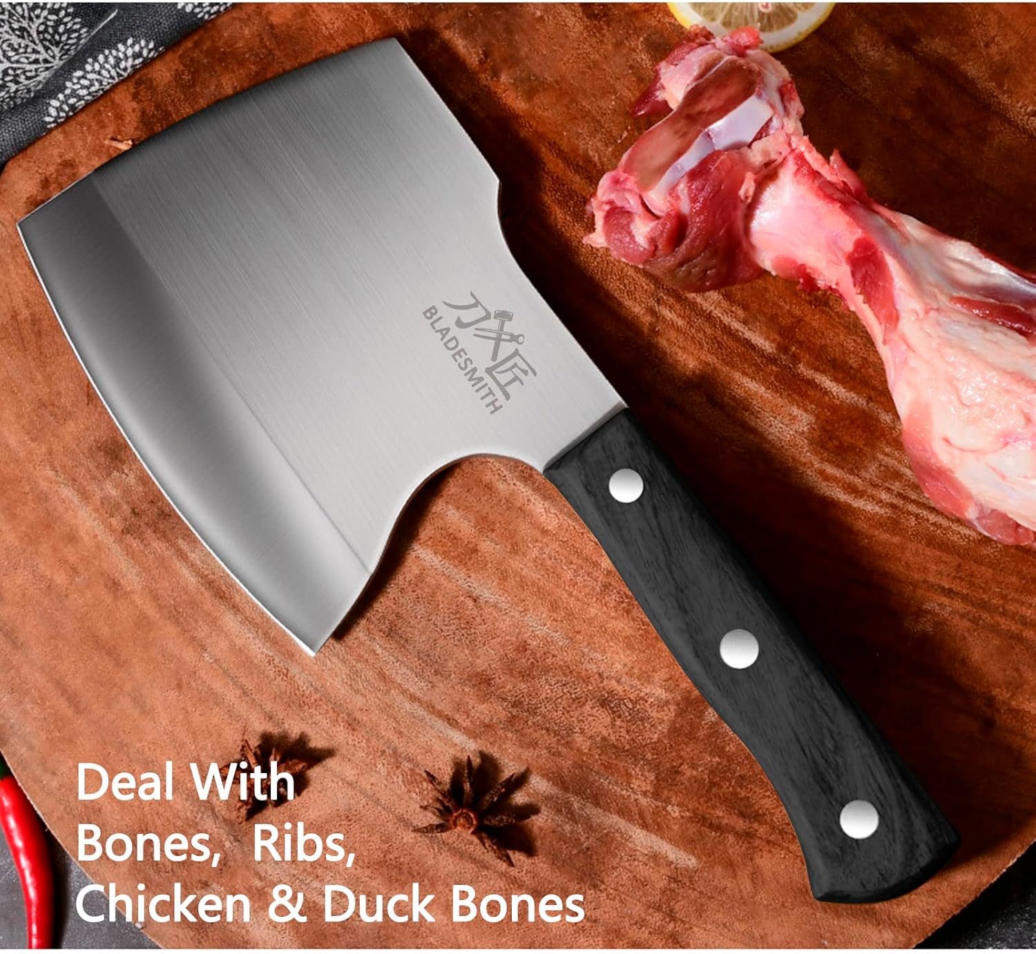 - ④【MULTIPURPOSE】- You'll know it can deal with tough bone guys by its thicken look, let alone you can use it for cutting meat, vegetable or even mashing potato and garlic with its spine. Just so easy! Oh, smashing bones with its spine is not a problem, either.