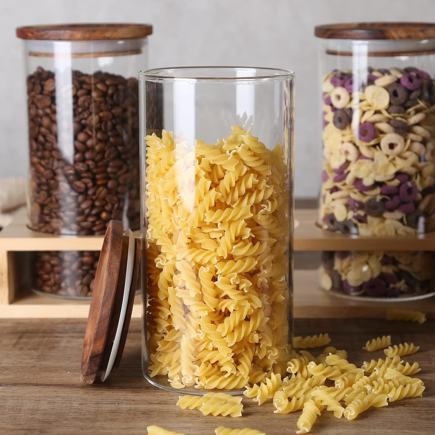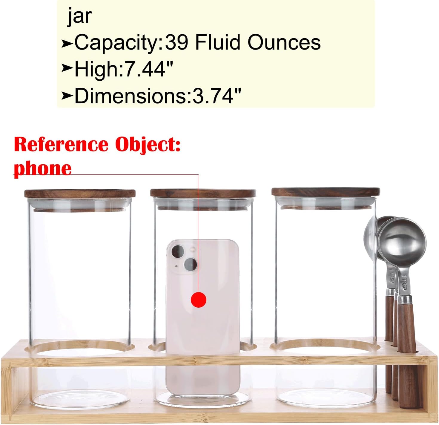 - Complete Set Includes:3 sealed glass jars(height 7.44" x diameter 3.74",capacity:39 floz/1150ml),3 wooden handle scoops(1 TBSP) and 1 bamboo rack(14.7" x 4.6" x 2.4",L x W x H),label stickers.