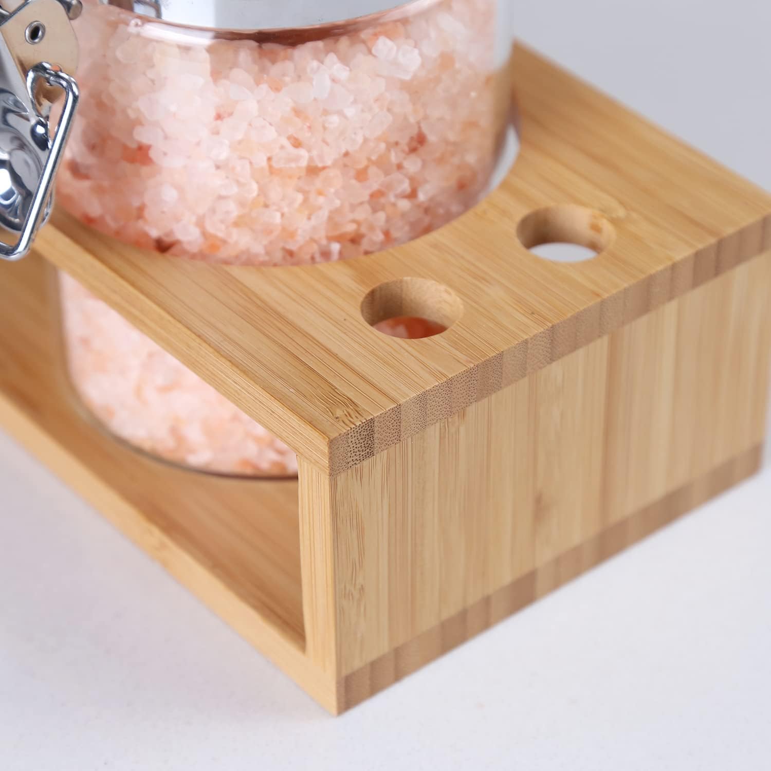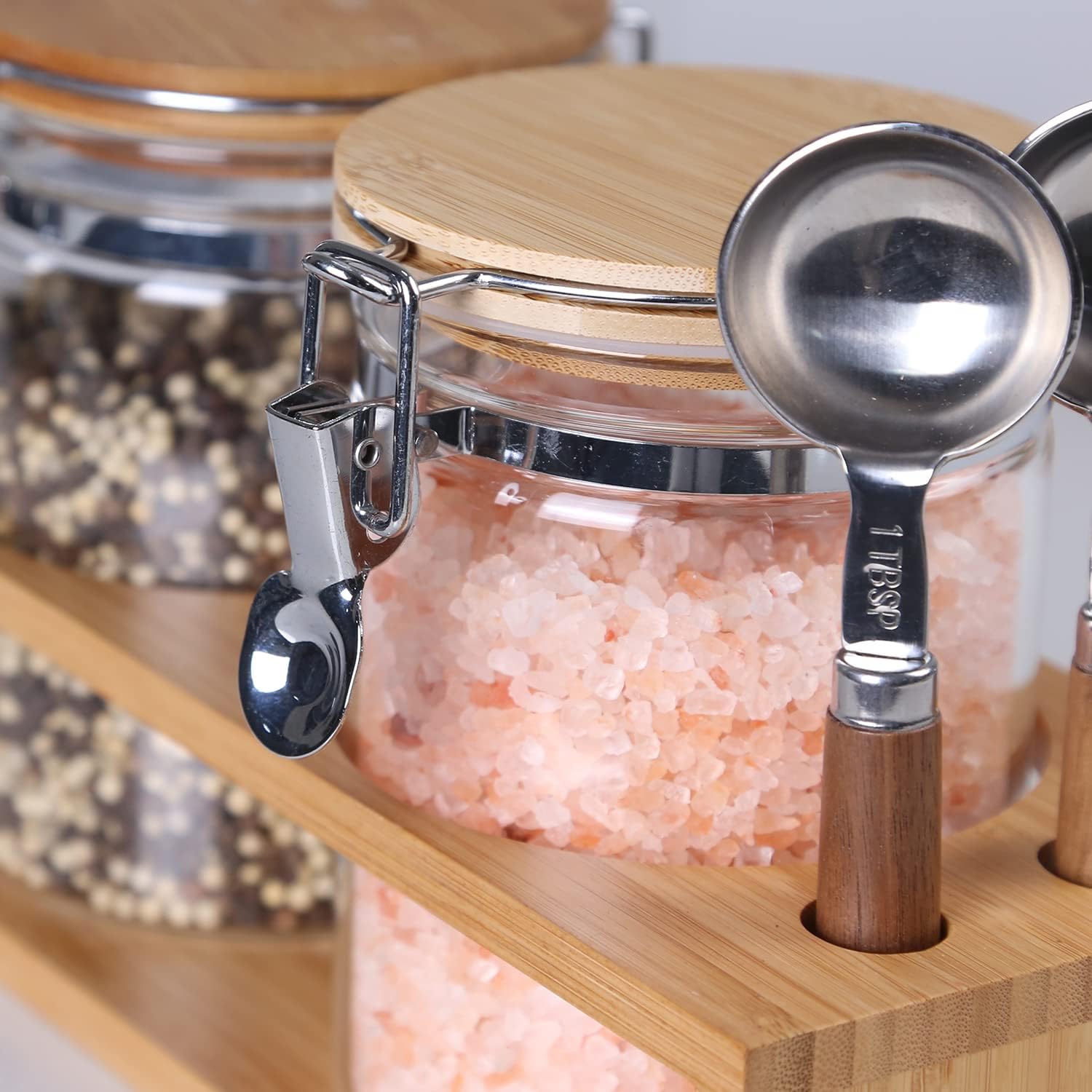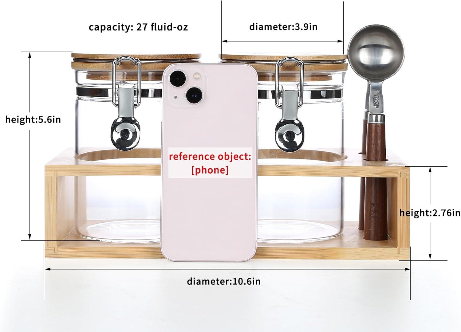 - Complete Set Includes:2 glass sealed jars (Height 5.12" x Diameter 3.9",Capacity:27floz/800ml),2 wooden handle scoops(1 TBSP),1 bamboo rack(10.6" x 4.5" x 2.76" ,L x W x H) and label stickers.