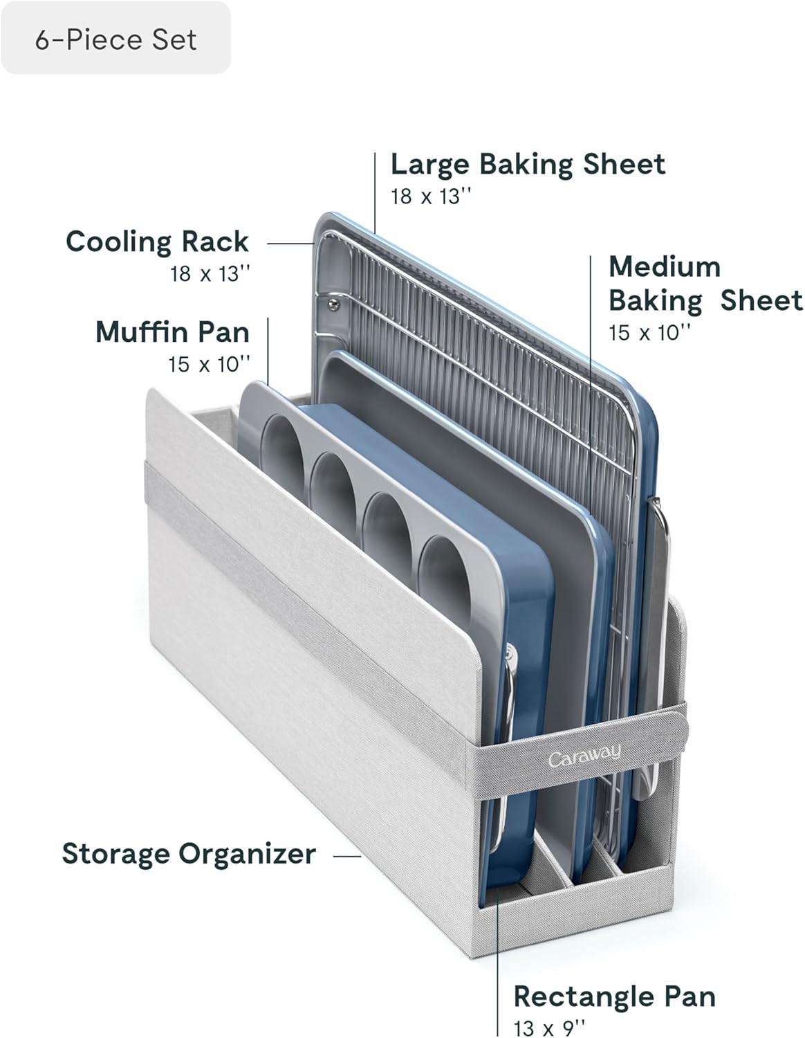 - WHAT'S IN THE BOX: Included in this 5-piece bakeware set is a 18x13" baking sheet, 10x15" baking sheet, 12 cup muffin pan, 9x13" rectangle pan, and 1 storage organizer.
