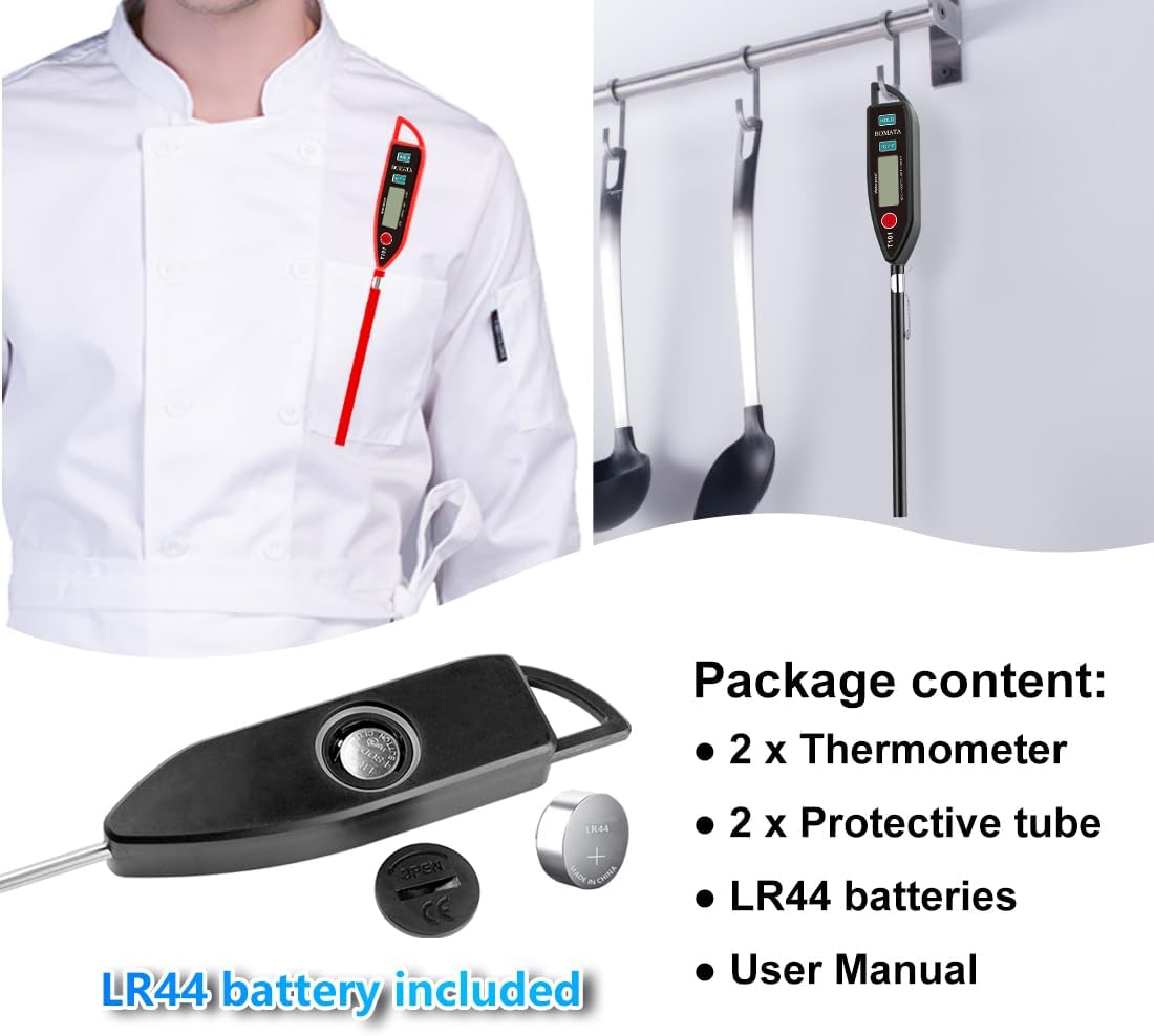 BOMATA 2 Pack Waterproof IPX7 Meat Thermometer Instant Read Food Thermometer with Long Probe for Water, Liquid, Kitchen Cooking, Grill,BBQ ! T101 X 2 Pcs (Black & Red)…
