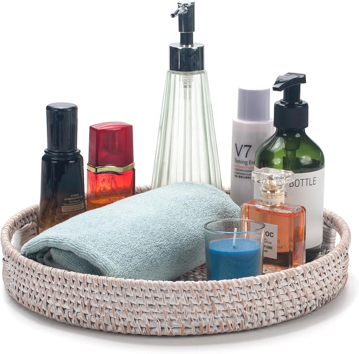 11.8 inch Round Rattan Tray, Decorative Coffee Table Trays, Ottoman Tray, Woven Serving Tray with Handles, Wicker Serving Basket, Whitewash
