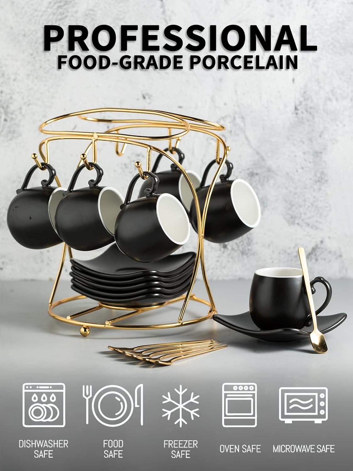 - This porcelain 3 oz coffee cups set is with modern and elegant design. The espresso coffee cup and saucer set with matted design style is delicate and elegant, and the golden metal holder design is high-end and gorgeous, making your morning more energetic! Ideal for espresso, latte, mocha, cappuccino, tea, etc.
