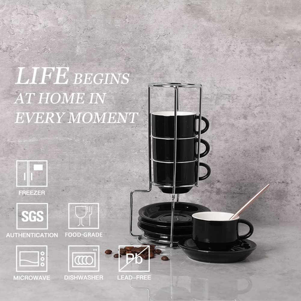 Sweejar Porcelain Espresso Cups with Saucers, 2.5 Ounce Stackable Cappuccino Cups with Metal Stand for Coffee Drinks, Latte, Tea - Set of 4 (Black)